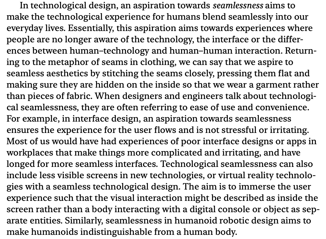 In technological design, an aspiration towards seamlessness aims to make the technological experience for humans blend seamlessly into our everyday lives. Essentially, this aspiration aims towards experiences where people are no longer aware of the technology, the interface or the differences between human-technology and human-human interaction. Considering the metaphor of seams in clothing, we can say that we aspire to seamless aesthetics by stitching the seams closely, pressing them flat and making sure they are hidden on the inside so that we wear clothing rather than pieces of fabric. When designers and engineers talk about technological seamlessness, they are often referring to ease of use and convenience. For example, in interface design, an aspiration towards seamlessness ensures the experience for the user flows and is not stressful or irritating. Most of us would have had experiences of poor interface designs or apps in workplaces that make things more complicated and irritating, and have longed for more seamless interfaces. Technological seamlessness can also include less visible screens in new technologies, or virtual reality technologies with a seamless technological design. The aim is to immerse the user experience such that the visual interaction might be described as inside the screen rather than a body interacting with a digital console or object as separate entities. Similarly, seamlessness in humanoid robotic design aims to make humanoids indistinguishable from a human body.
