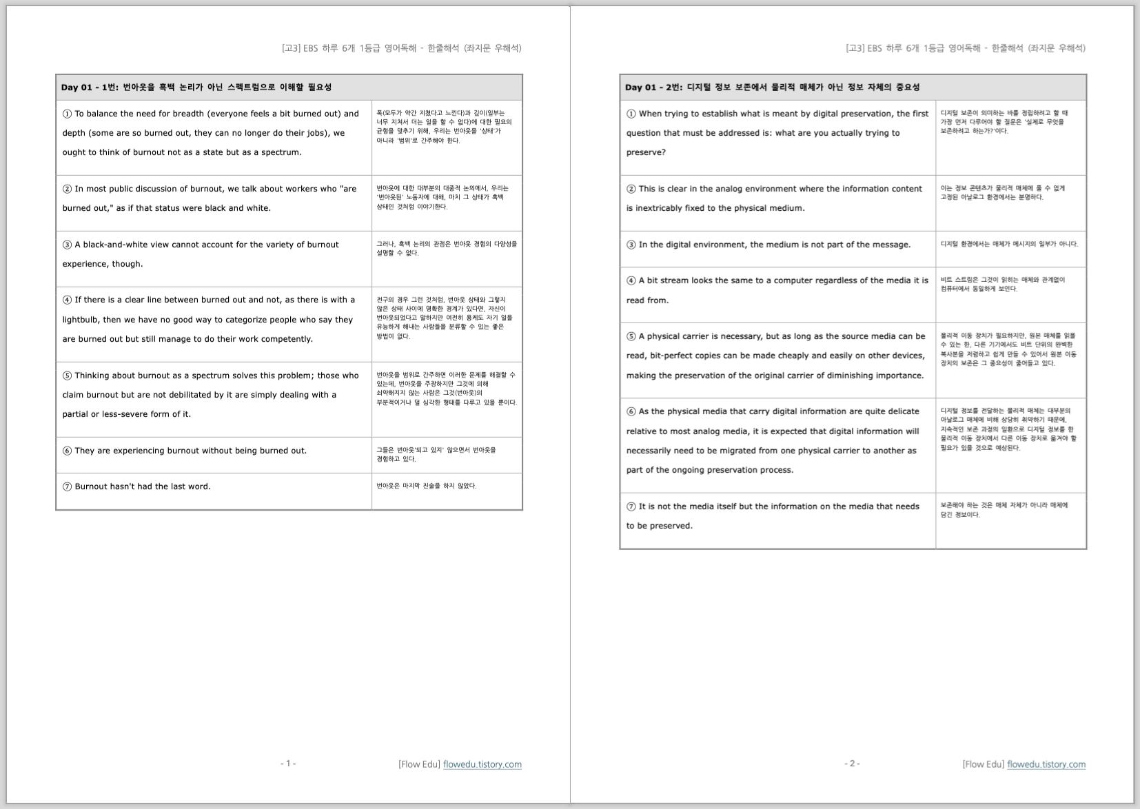 안녕하세요, Flow 영어연구소입니다.오늘은 고등학교에서 영어 부교재로 사용되는[고3] EBS 하루 6개 1등급 영어독해> 교재에 대한 한줄해석 자료를 정리해 공유합니다. 실용문을 포함한 전체 지문