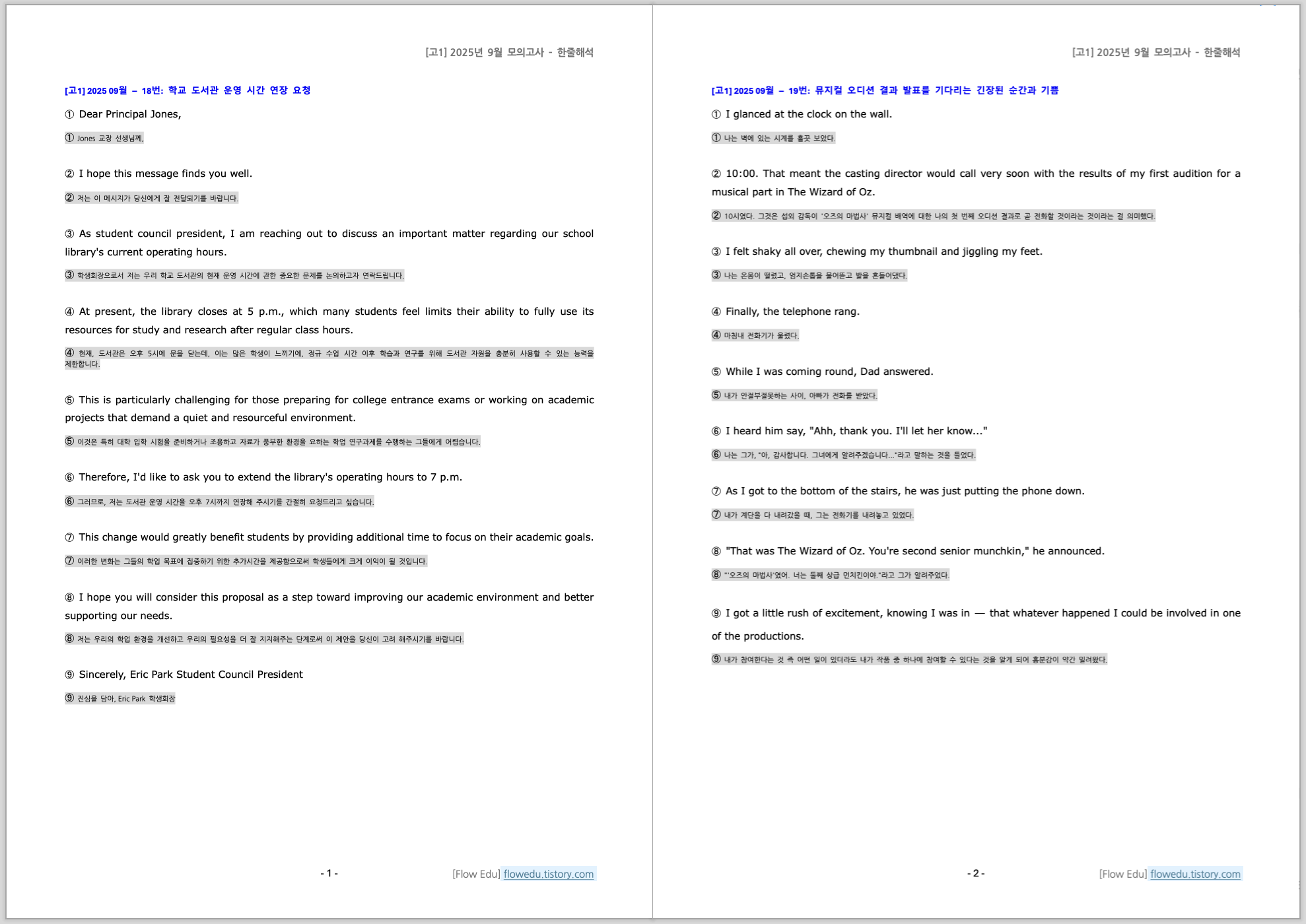 안녕하세요, Flow 영어연구소입니다. 오늘은 2025년도 9월 고1 영어 모의고사>의 한줄해석(좌지문 우해석) 자료 올립니다.설명문/실용문 포함 전지문 작업했습니다. 자료는 PDF와 Word 파일 모두 올립