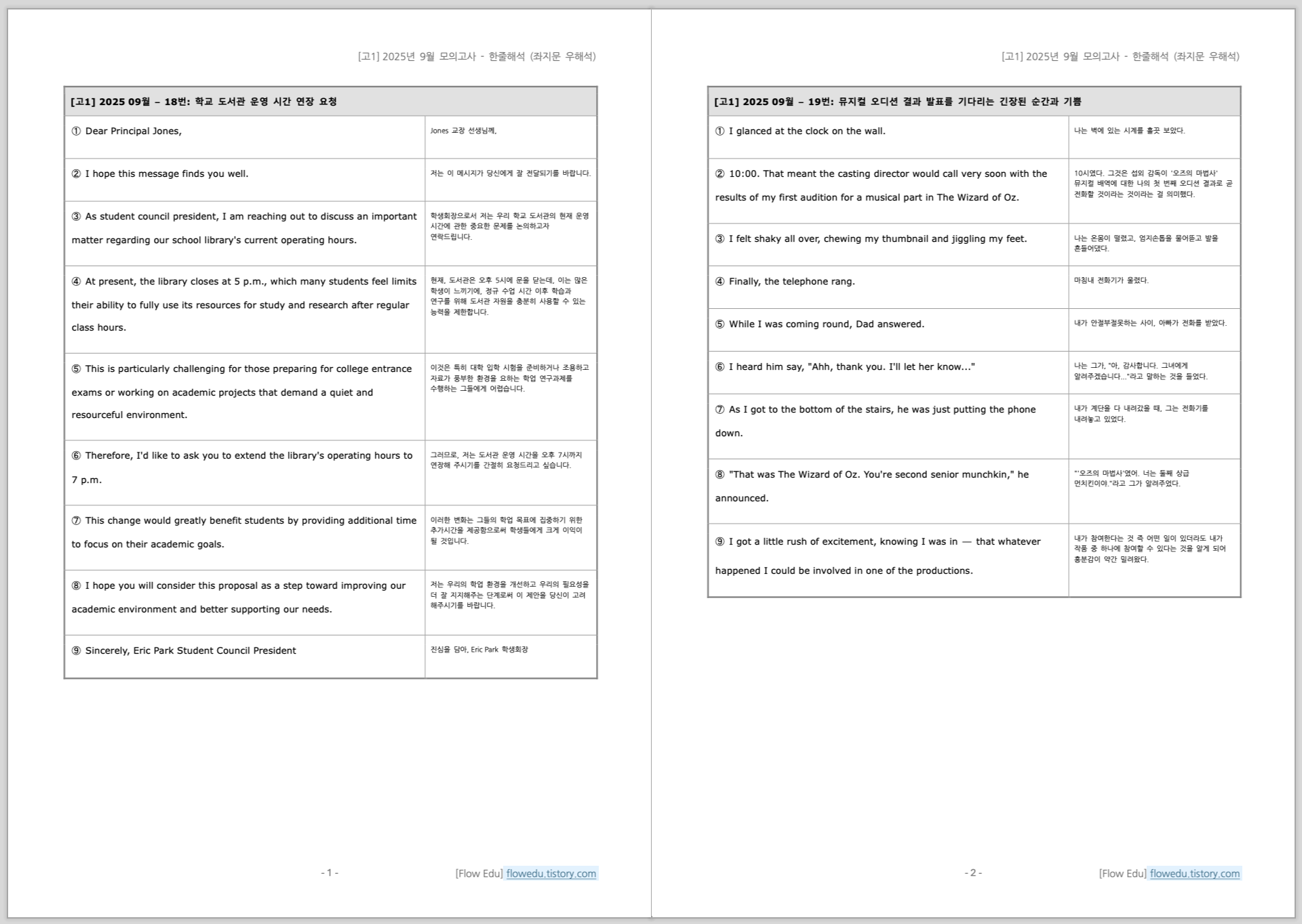 안녕하세요, Flow 영어연구소입니다. 2025년도 9월 고1 영어 모의고사>의 한줄해석 자료 올립니다.설명문/실용문을 포함 모든 지문을 대상으로 작업했습니다. 자료는 PDF와 Word 파일 모두 올립니다.