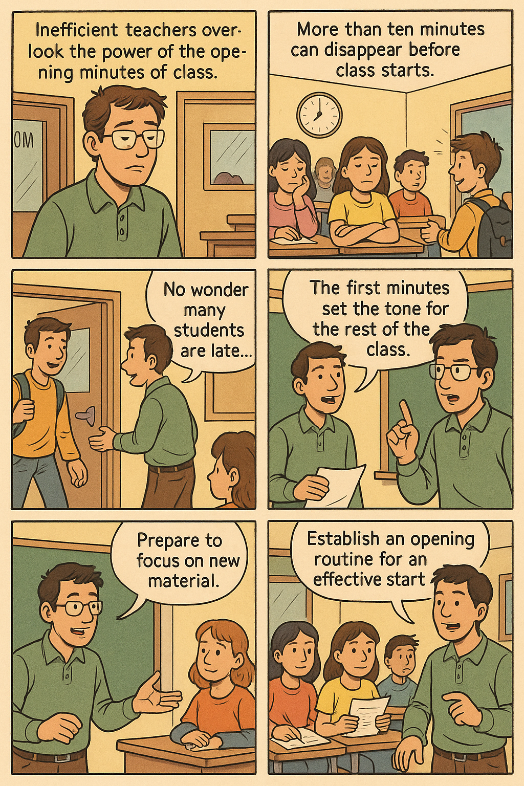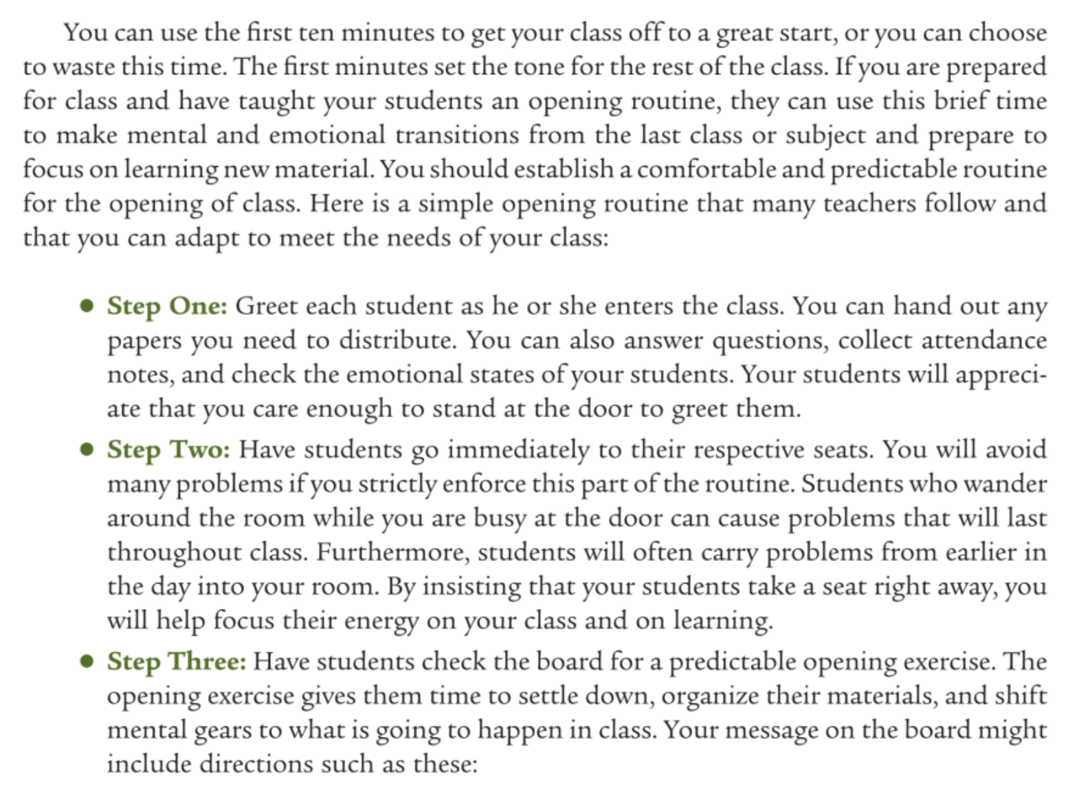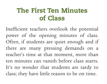 Inefficient teachers overlook the potential power of the opening minutes of class. Often, if students are quiet enough and if there are many pressing demands on a teacher's time at that moment, more than ten minutes can disappear before class starts. It's no wonder that students are late for class; they have little reason to be on time. You can use the first ten minutes to get your class off to a great start, or you can choose to waste this time. The first minutes set the tone for the rest of the class. If you are prepared for class and have taught your students an opening routine, they can use this brief time to make mental and emotional transitions from the last class or subject and prepare to focus on learning new material. In summary, you should establish an opening routine to develop your class with an effective start.