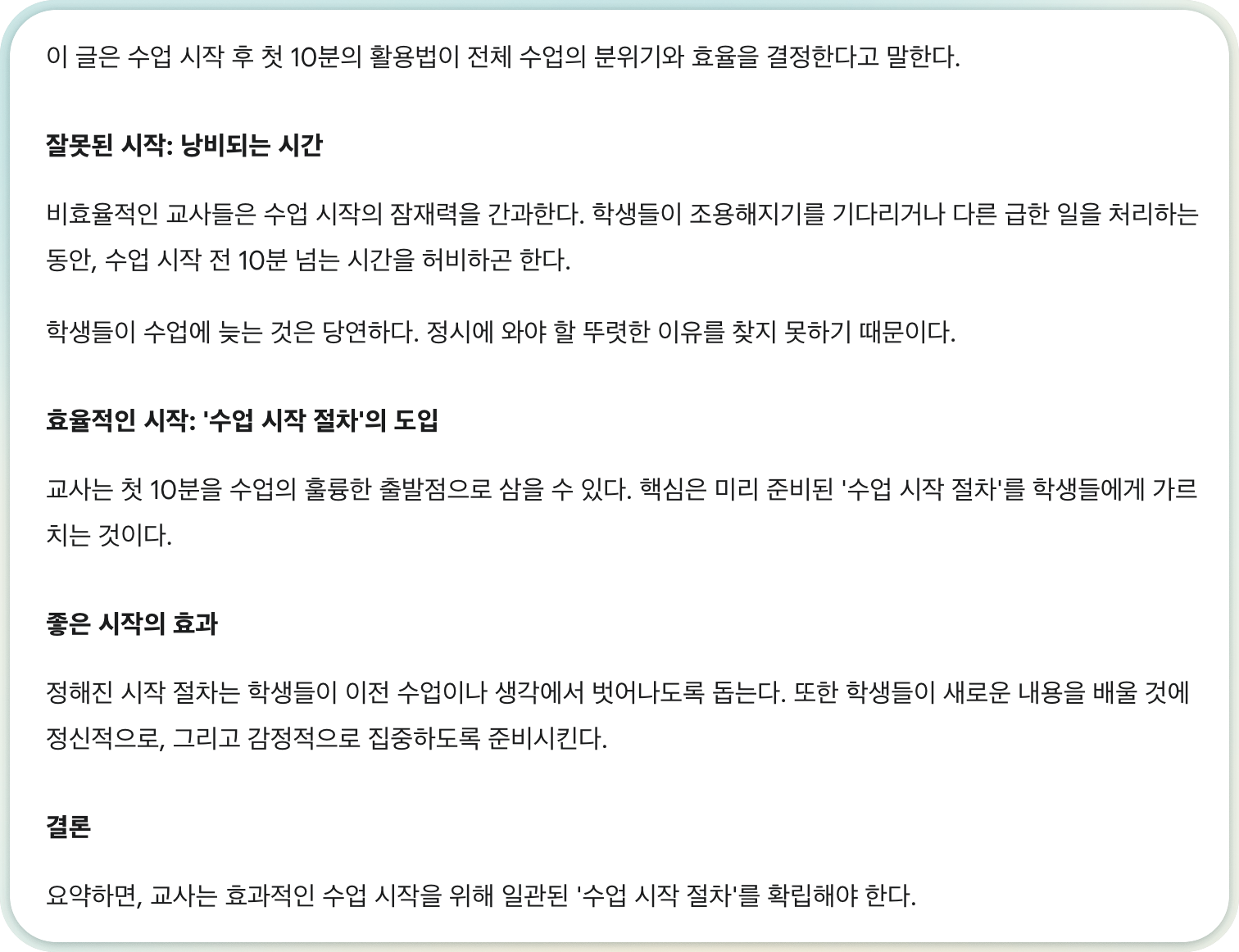 | 해결책 제안 | 첫 10분을 잘 활용하면 수업 분위기를 좋게 만들 수 있고, 낭비할 수도 있다 | You can use the first ten minutes to get your class off to a great start, or you can choose to waste this time. The first minutes set the tone for the rest of the class. |