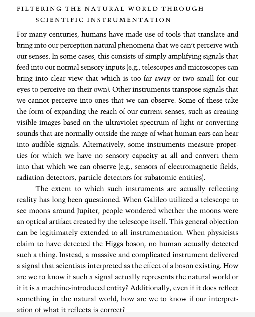 | 근거 | 인간 감각으로는 전혀 인지할 수 없는 성질도 기계가 측정해 관찰할 수 있도록 바꿀 수 있다 | Alternatively, some instruments measure properties for which we have no sensory capacity at all and change them into that which we can observe. |
