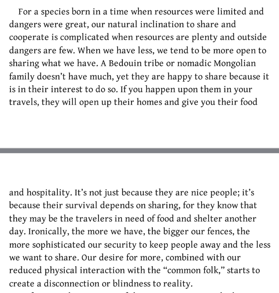 For a species born in a time when resources were limited and dangers were great, our natural tendency to share and cooperate is complicated when resources are plenty and outside dangers are few. When we have less, we tend to be more open to sharing what we have. Certain nomadic tribes don't have much, yet they are happy to share because it is in their interest to do so. If you happen upon them in your travels, they will open up their homes and give you their food and hospitality. It's not just because they are nice people; it's because their survival depends on sharing, for they know that they may be the travelers in need of food and shelter another day. Ironically, the more we have, the bigger our fences, the more sophisticated our security to keep people away and the less we want to share. Our desire for more, combined with our decreased physical interaction with the "common folk," starts to create a disconnection or blindness to reality.