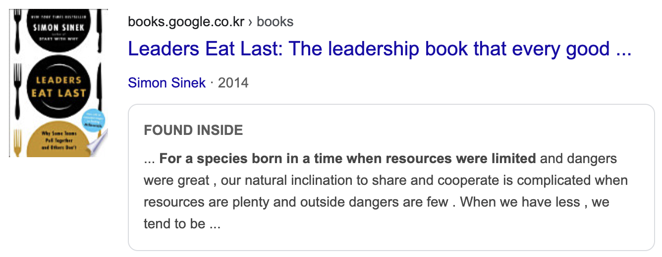 | 주장 | 자원이 부족하고 위험이 많은 시대에 태어난 인간의 본능적 협력은 자원이 풍부하고 위험이 적을 때 복잡해진다 | For a species born in a time when resources were limited and dangers were great, our natural tendency to share and cooperate is complicated when resources are plenty and outside dangers are few. |