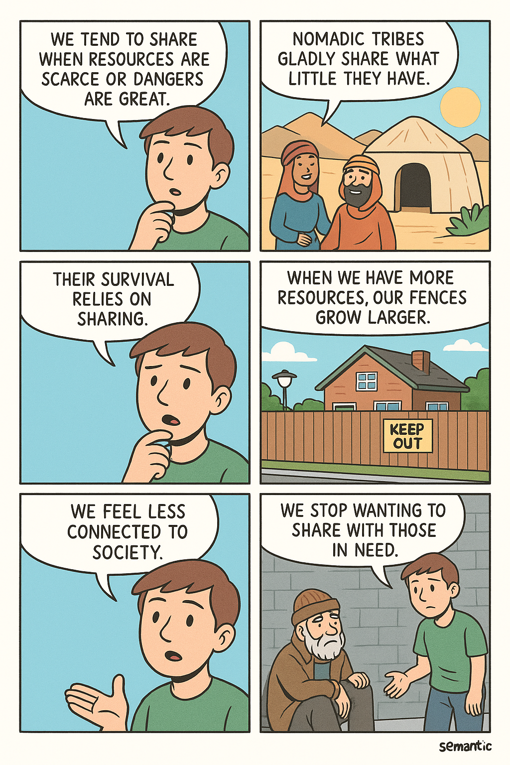 | 근거 | 자원이 적을 때 사람들은 더 많이 나누려 하며, 유목 부족은 생존을 위해 기꺼이 나눈다 | When we have less, we tend to be more open to sharing what we have. Certain nomadic tribes don't have much, yet they are happy to share because it is in their interest to do so. |