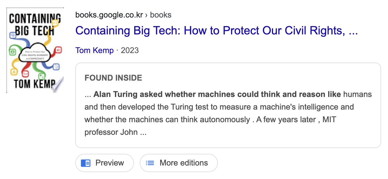 | 근거 | 1950년 앨런 튜링은 기계가 인간처럼 사고할 수 있는지 물었고, 이를 측정하기 위해 튜링 테스트를 만들었다 | In 1950, British mathematician Alan Turing asked whether machines could think and reason like humans and then developed the Turing test to measure a machine's intelligence and whether the machines can think autonomously. |