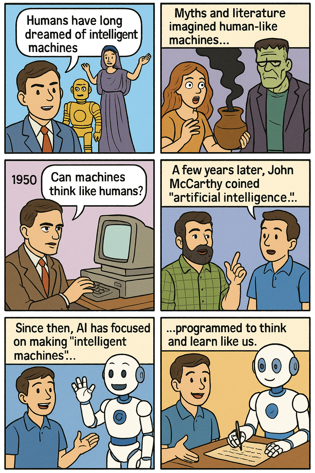 Humans for centuries have dreamed of machines that could become intelligent and make human-like decisions. There have been myths about robots, automatons, and artificial beings since ancient Greece (e.g., the myth of Pandora, who released ills upon the world). Likewise, literature throughout history has dreamed of creating human-like creatures and thinking machines (e.g., Mary Shelley's Frankenstein). In 1950, British mathematician Alan Turing asked whether machines could think and reason like humans and then developed the Turing test to measure a machine's intelligence and whether the machines can think autonomously. A few years later, MIT professor John McCarthy coined "artificial intelligence," replacing the previously used expression "automata studies." Since then, artificial intelligence has become the study and practice of "making intelligent machines" that are programmed to think like humans ─ endowed by their creators with reasoning and learning.