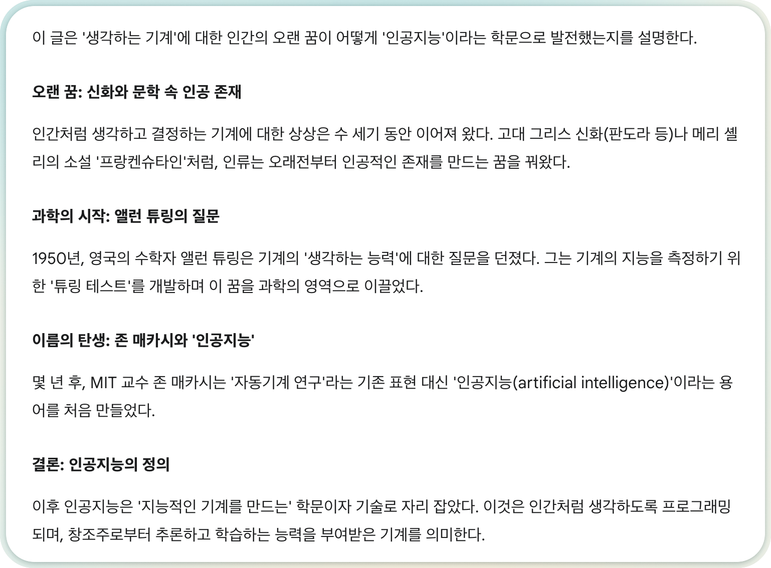 | 결론 | 인공지능은 인간처럼 사고하도록 프로그래밍된 지능적 기계를 만드는 연구와 실천의 영역으로 자리 잡았다 | Since then, artificial intelligence has become the study and practice of "making intelligent machines" that are programmed to think like humans ─ endowed by their creators with reasoning and learning. |