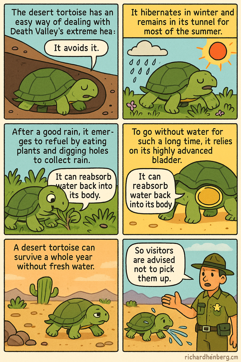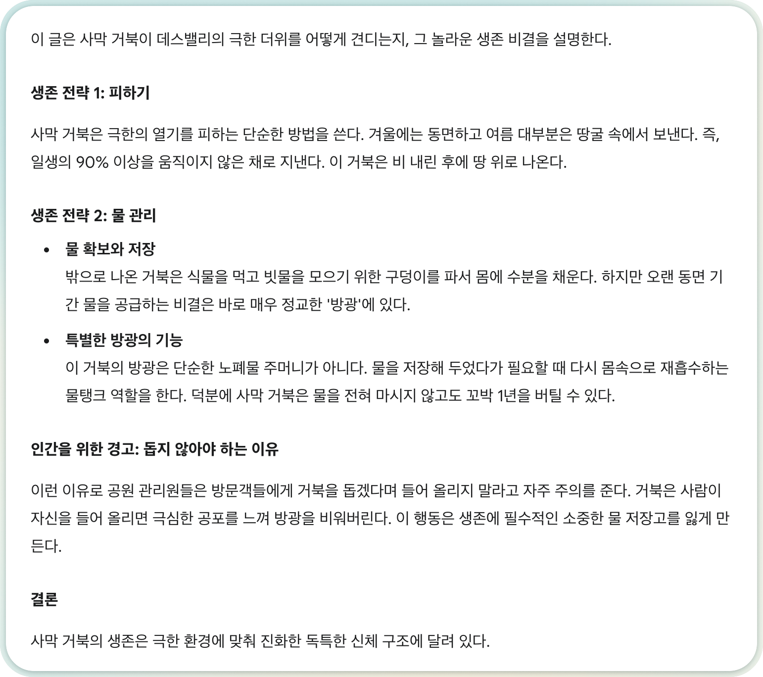 | 결론/경고 | 방광은 생존에 필수적이므로, 사람들이 거북을 들어 올리면 방광을 비워 치명적일 수 있다고 공원 관리인은 주의를 준다 | And because its bladder is so important to a tortoise's survival, park rangers often remind visitors not to stop and help the slow-movers across the road. Tortoises become so terrified when people pick them up that they empty their bladders, losing their precious water reserves. |