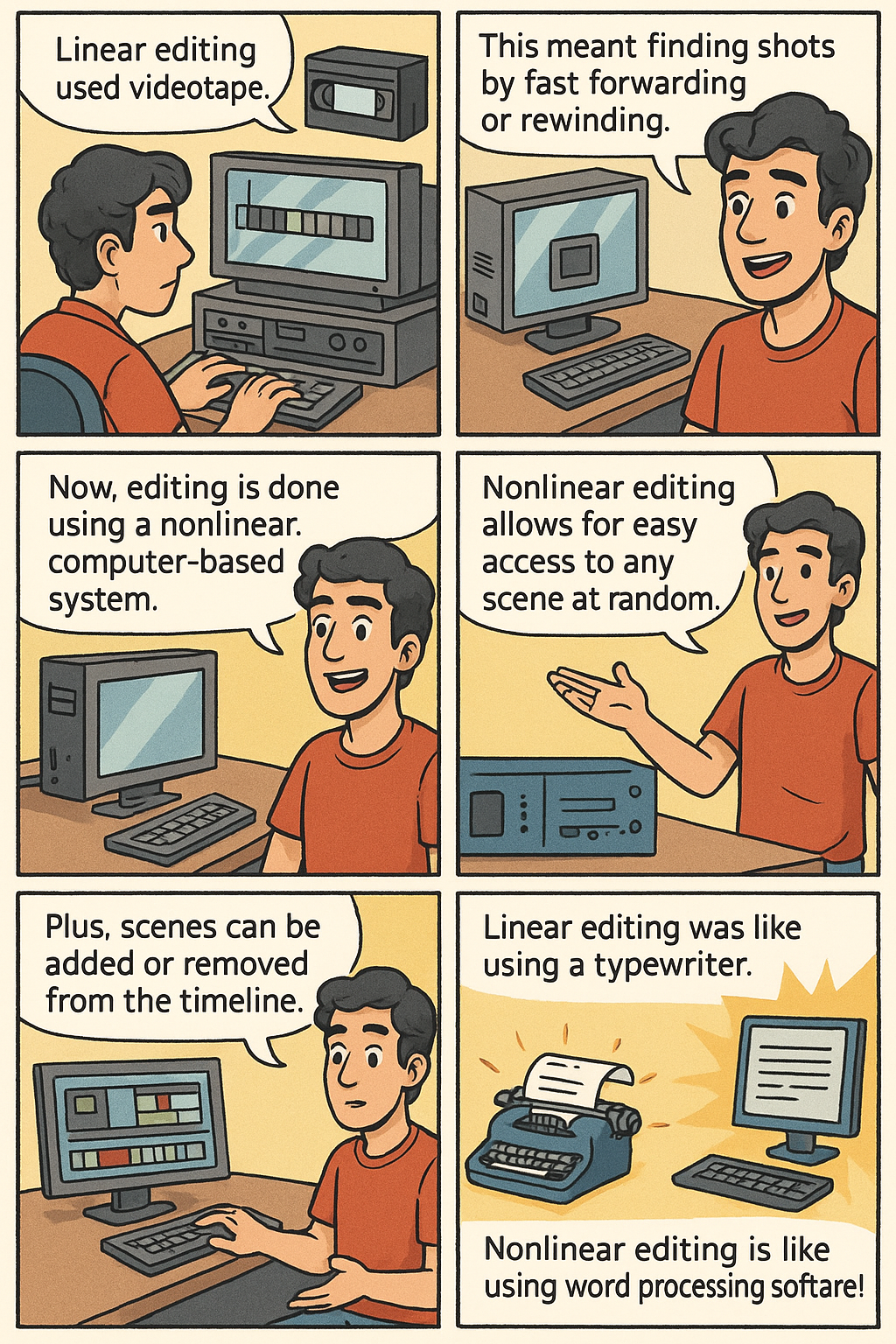 | 비유 (대조) | 선형 편집은 타자기와 같아, 실수나 추가가 있으면 전체를 다시 쳐야 했다 | Linear editing was like composing a paper on a typewriter. If a mistake was made or new information needed to be added the whole piece had to be retyped. |
