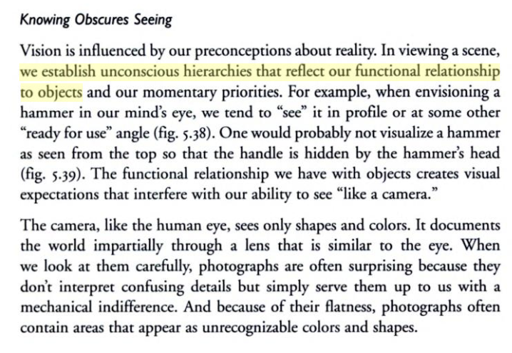 | 근거 | 기능적 관계는 시각적 기대를 만들고, 이는 우리가 카메라처럼 대상을 객관적으로 보는 것을 방해한다 | The functional relationship we have with objects creates visual expectations that interfere with our ability to see "like a camera." |