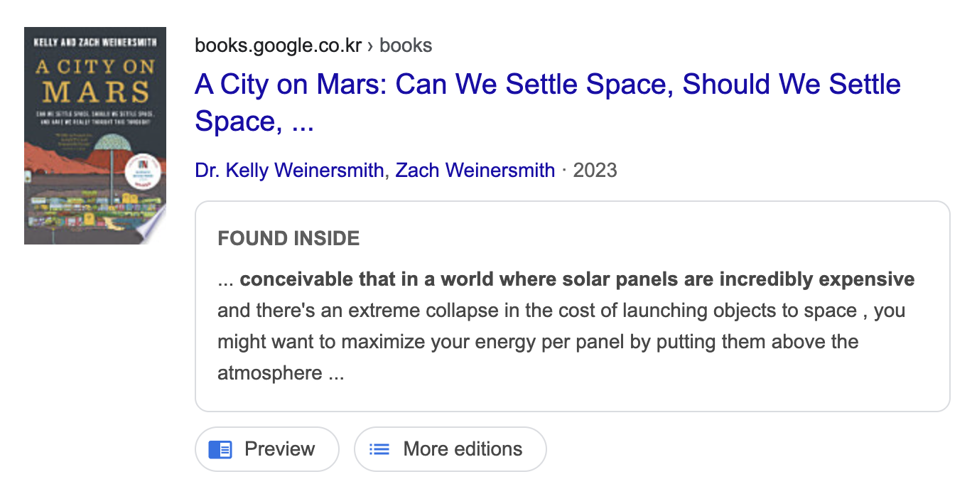 | 가정 | 태양광 패널이 매우 비싸고 발사 비용이 극적으로 낮다면 우주에 설치하는 것이 고려될 수 있다 | It's conceivable that in a world where solar panels are incredibly expensive and there's an extreme collapse in the cost of launching objects to space, you might want to maximize your energy per panel by putting them above the atmosphere. |