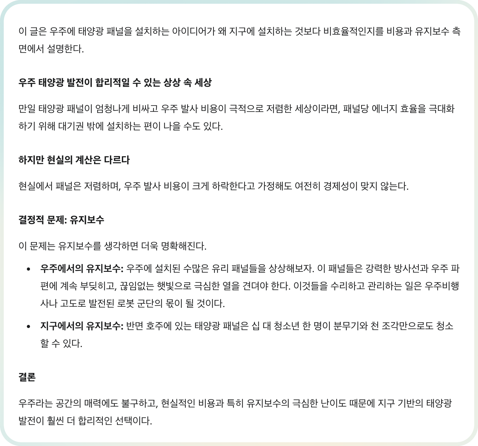 | 근거 | 유지·보수를 고려하면 문제는 더 분명해진다. 우주에서는 방사선, 우주 파편, 극한의 열에 지속적으로 노출된다 | This becomes especially clear when you start to think about maintenance. Try to imagine acres upon acres of glass panels in space, regularly hit by intense radiation and bits of space debris while enduring the extreme heat of constant sunlight. |
