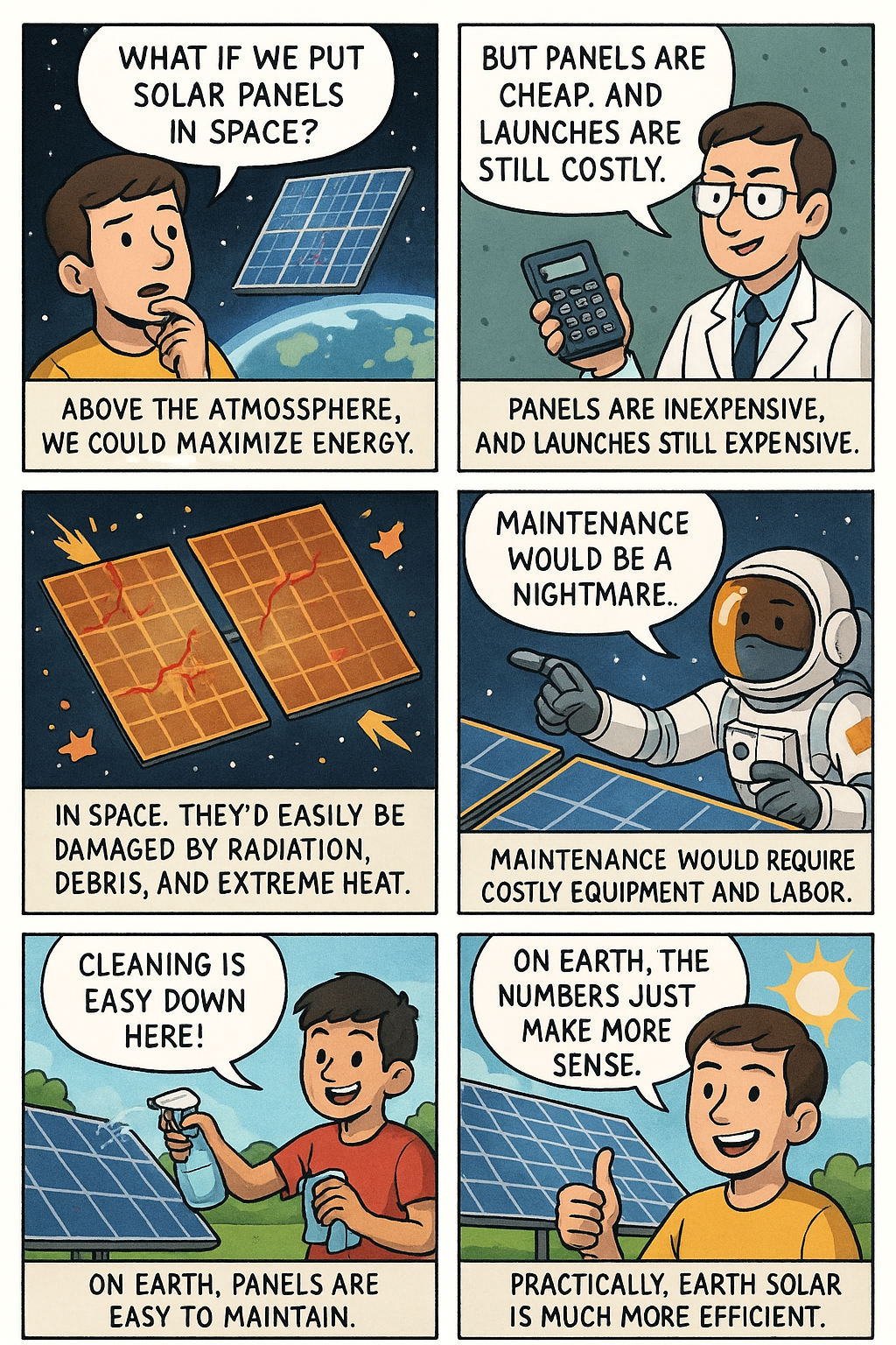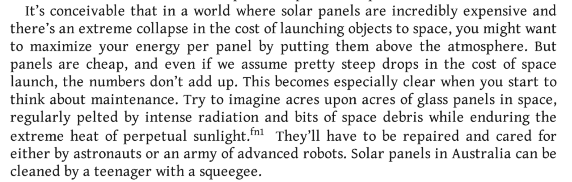 It's conceivable that in a world where solar panels are incredibly expensive and there's an extreme collapse in the cost of launching objects to space, you might want to maximize your energy per panel by putting them above the atmosphere. But panels are cheap, and even if we assume pretty steep drops in the cost of space launch, the numbers don't add up. This becomes especially clear when you start to think about maintenance. Try to imagine acres upon acres of glass panels in space, regularly hit by intense radiation and bits of space debris while enduring the extreme heat of constant sunlight. They'll have to be repaired and cared for either by astronauts or an army of advanced robots. Solar panels in Australia can be cleaned by a teenager with a spray bottle and a cloth.