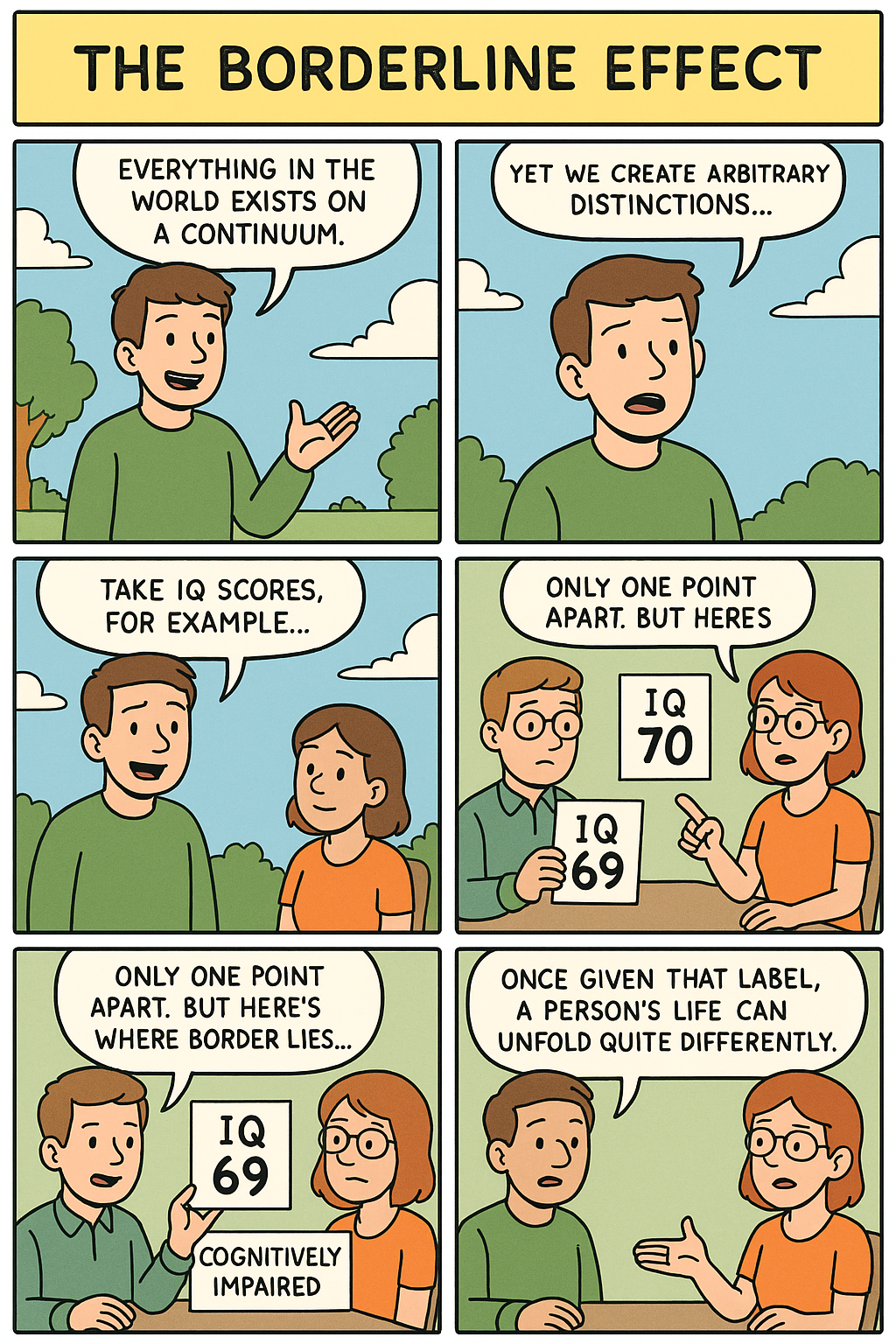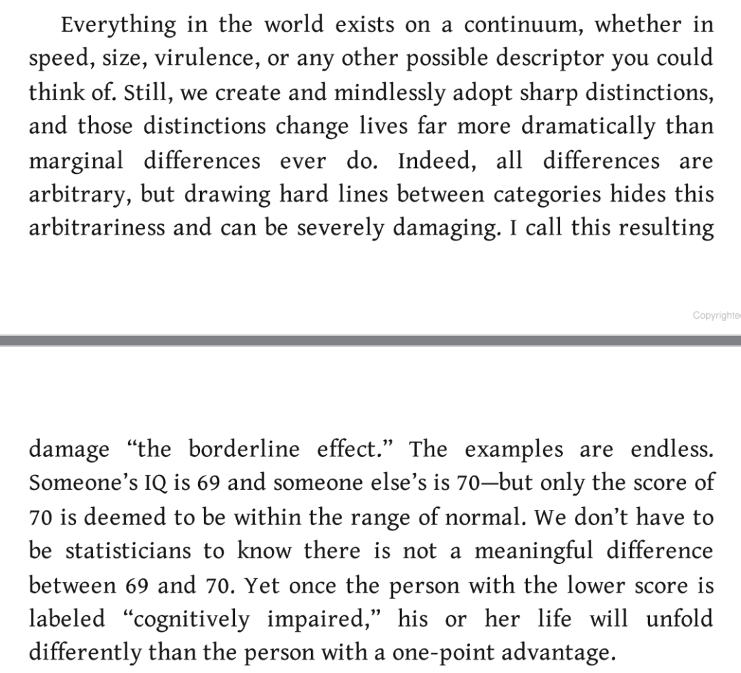 Everything in the world exists on a continuum, whether in speed, size, or any other possible descriptor you could think of. Still, we create and mindlessly adopt sharp distinctions, and those distinctions change lives far more dramatically than marginal differences ever do. Indeed, all differences are arbitrary, but drawing hard lines between categories hides this arbitrariness and can be severely damaging. I call this resulting damage "the borderline effect." The examples are endless. Someone's IQ is 69 and someone else's is 70 ─ but only the score of 70 is deemed to be within the range of normal. We don't have to be statisticians to know there is not a meaningful difference between 69 and 70. Yet once the person with the lower score is labeled "cognitively impaired," his or her life will unfold differently than the person with a one-point advantage.
