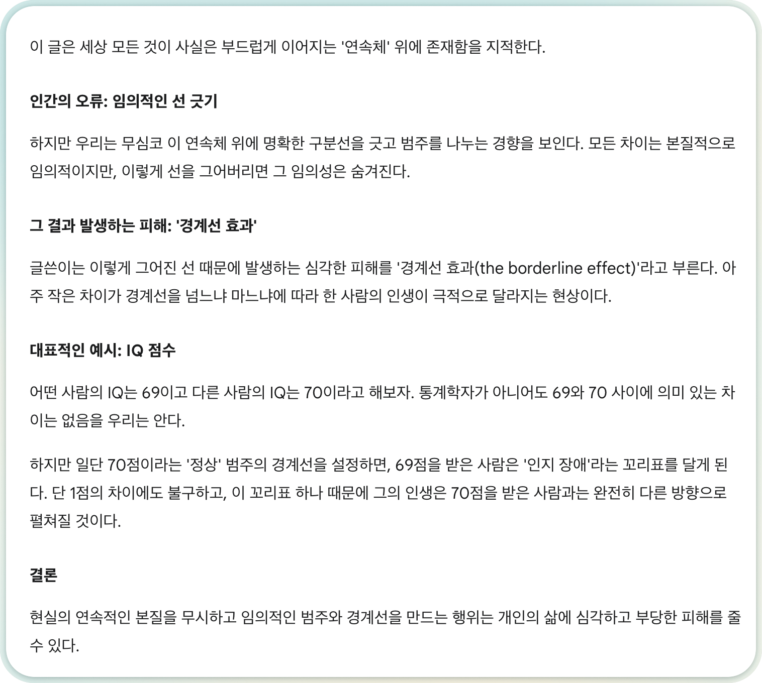 | 예시 | IQ 점수 69와 70은 의미 있는 차이가 없지만, 경계선 때문에 한 사람은 정상으로, 다른 사람은 장애로 분류된다 | The examples are endless. Someone's IQ is 69 and someone else's is 70 ─ but only the score of 70 is deemed to be within the range of normal. We don't have to be statisticians to know there is not a meaningful difference between 69 and 70. Yet once the person with the lower score is labeled "cognitively impaired," his or her life will unfold differently than the person with a one-point advantage. |