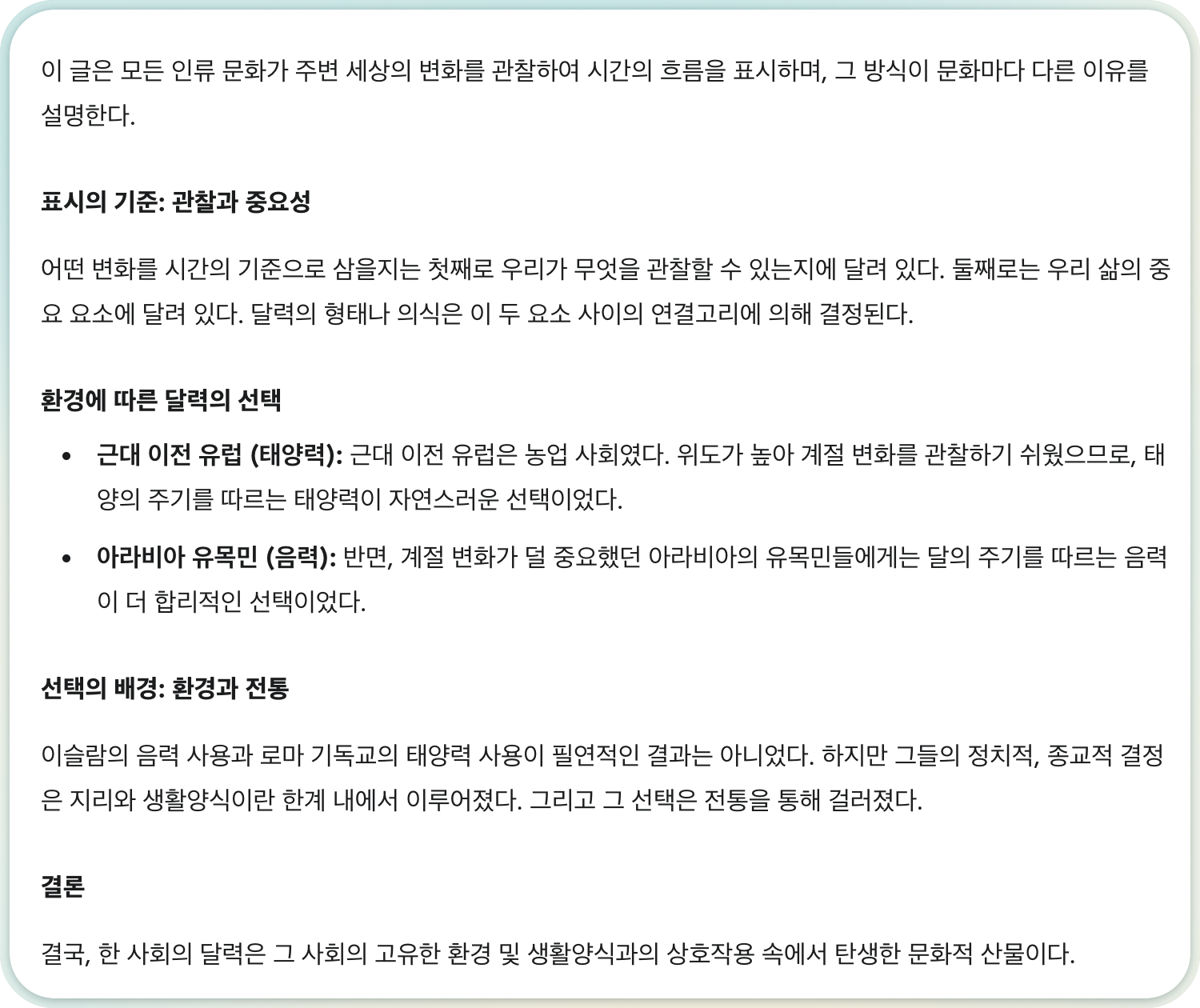 | 결론 | 이슬람이 음력, 로마 기독교가 양력을 선택한 것은 지리·생활·전통의 영향을 받은 정치적·종교적 결정이었다 | That did not make it inevitable that Islam would use a lunar calendar and Roman Christianity a solar one, but political and religious decisions were made from options limited by geography and lifestyle, filtered through tradition. |