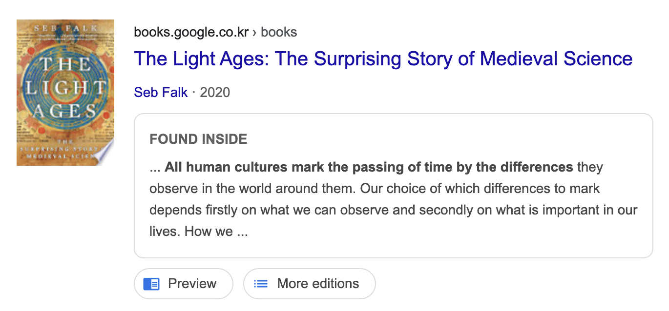 | 주장 | 모든 인간 문화는 주변 세계의 차이를 관찰하며 시간을 표시한다 | All human cultures mark the passing of time by the differences they observe in the world around them. Our choice of which differences to mark depends firstly on what we can observe and secondly on what is important in our lives. How we mark the differences ─ the shapes of our calendars and our rituals ─ depends on the connections we make between those two things. |