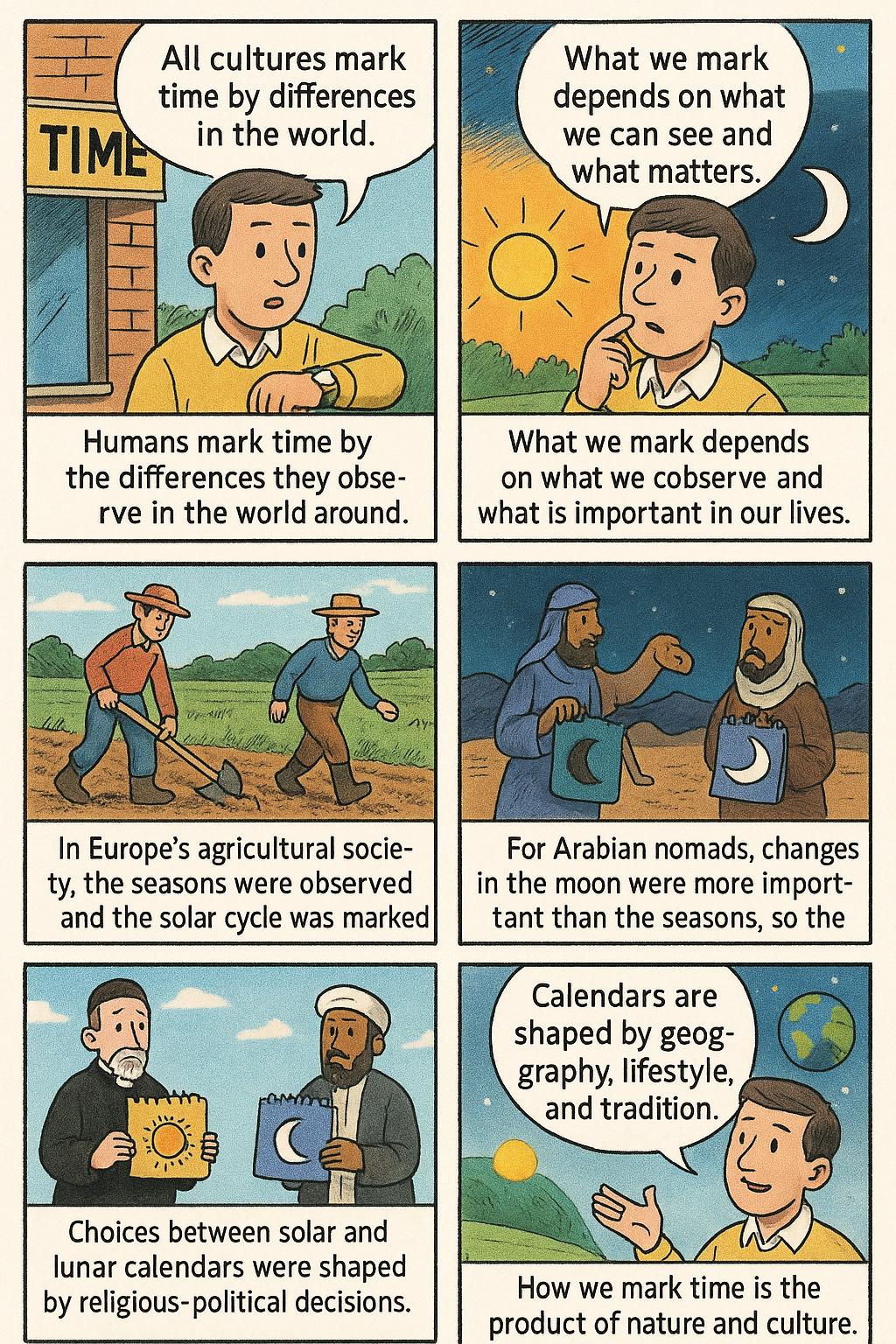All human cultures mark the passing of time by the differences they observe in the world around them. Our choice of which differences to mark depends firstly on what we can observe and secondly on what is important in our lives. How we mark the differences ─ the shapes of our calendars and our rituals ─ depends on the connections we make between those two things. In the agricultural society of pre-modern Europe, where higher latitudes make the seasons easily observable, it was natural to monitor the solar cycle. Conversely, among the largely nomadic peoples of Arabia, for whom seasonal changes were less significant, the lunar calendar was a more sensible choice. That did not make it inevitable that Islam would use a lunar calendar and Roman Christianity a solar one, but political and religious decisions were made from options limited by geography and lifestyle, filtered through tradition.