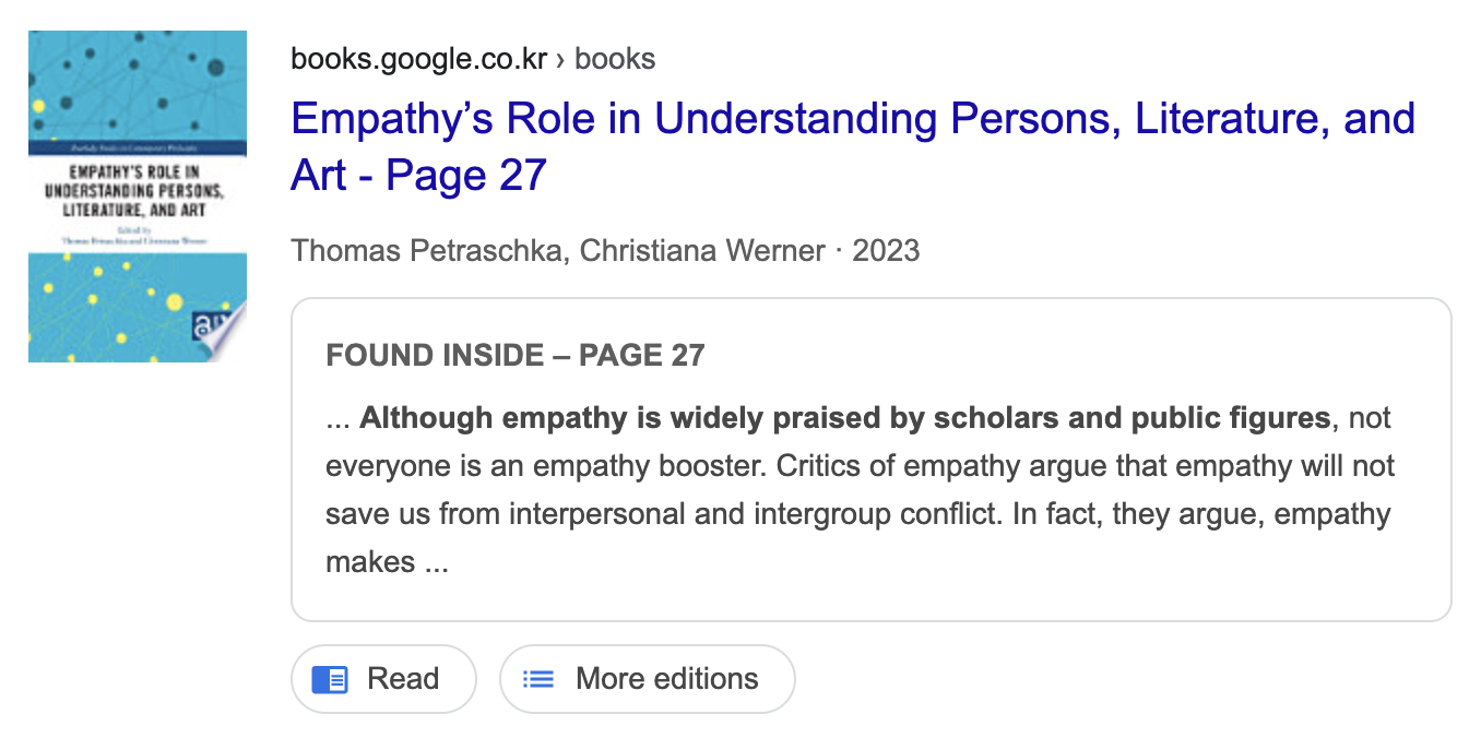 | 근거 3 | 낯선 집단이나 상황에서 공감하려 해도 정확히 이해하지 못해 오해와 좌절을 낳을 수 있다 | Finally, even when we try to empathize with others who are dissimilar from us or in unfamiliar contexts, sometimes we are unable to accurately empathize with their experiences, causing further misunderstandings and frustration. |