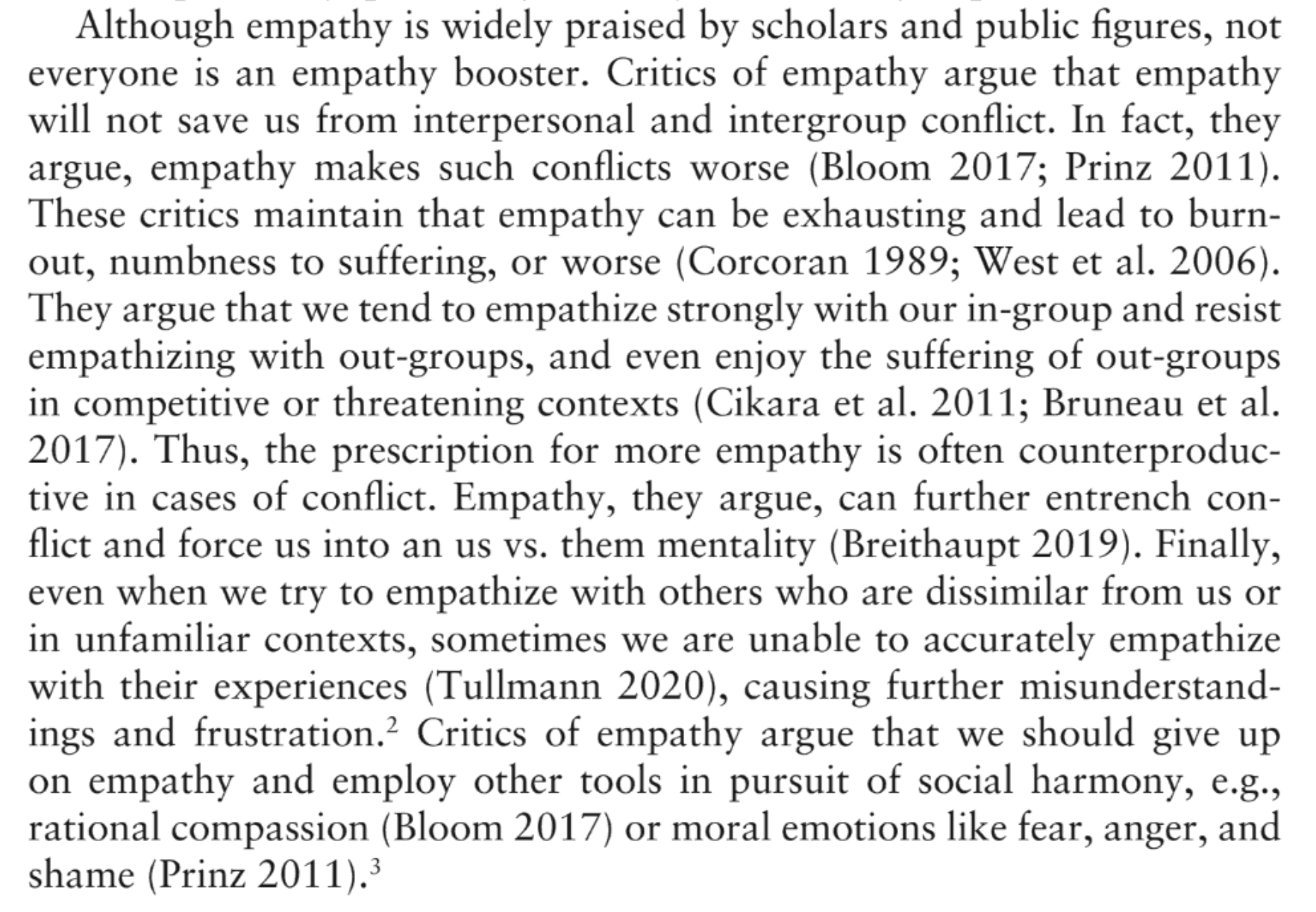 | 4 | These critics maintain that empathy can be exhausting and lead to burnout or insensitivity to suffering. | These critics maintain that empathy can be exhausting and lead to burnout, numbness to suffering, or worse. |