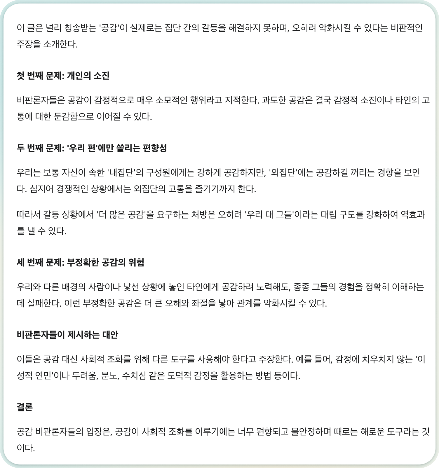 | 문제 제기 | 공감은 칭찬받지만, 비판자들은 공감이 갈등 해결책이 아니며 오히려 갈등을 악화시킨다고 본다 | Although empathy is widely praised by scholars and public figures, not everyone is an empathy booster. Critics of empathy argue that empathy will not save us from interpersonal and intergroup conflict. In fact, they argue, empathy makes such conflicts worse. |