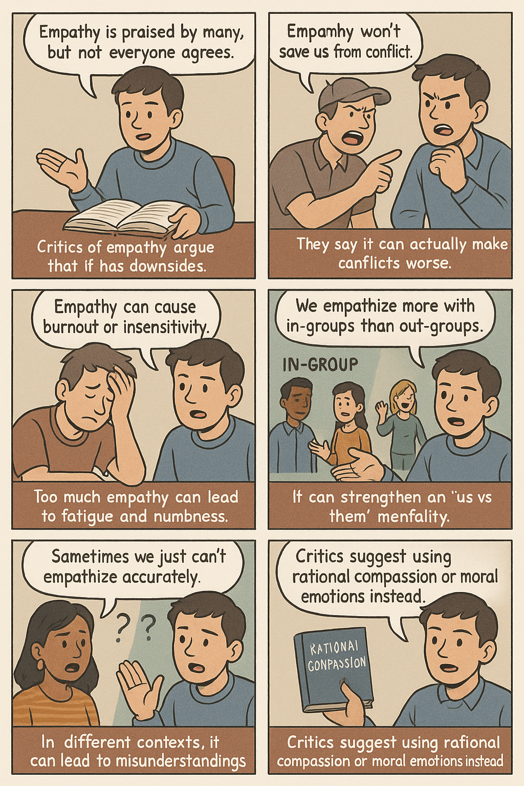 | 결론/대안 | 비판자들은 공감을 버리고 합리적 연민이나 두려움·분노·수치심 같은 도덕적 감정을 활용해야 한다고 본다 | Critics of empathy argue that we should give up on empathy and employ other tools in pursuit of social harmony, e.g., rational compassion or moral emotions like fear, anger, and shame. |