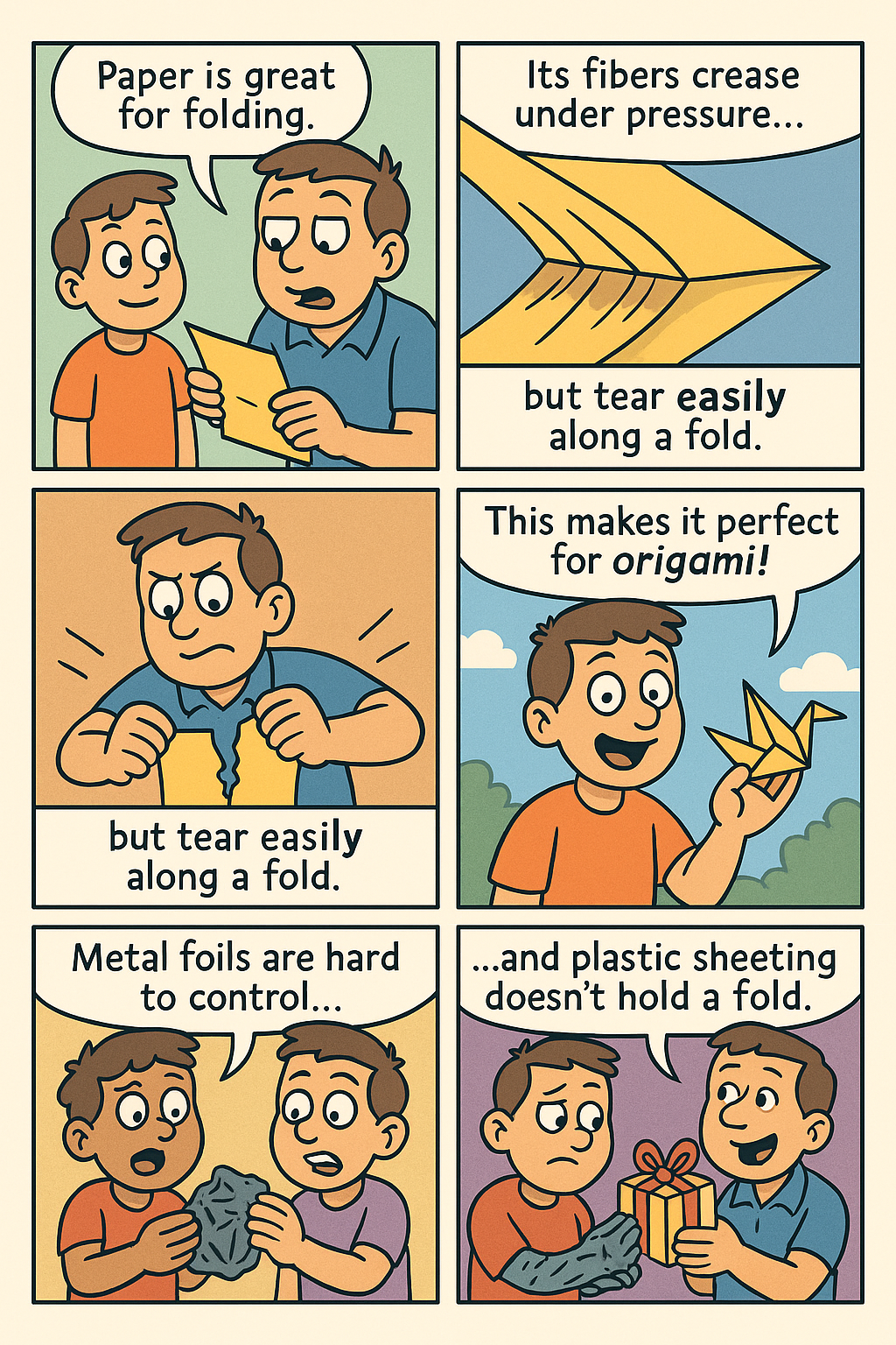 | 근거 | 종이는 접기와 굽힘에 잘 맞는 기계적 성질을 가지며, 섬유가 부분적으로 끊어져도 갈라지지 않고 접힘을 유지한다 | Paper's mechanical properties lend themselves to folding and bending. The cellulose fibers of which it is made can be partially snapped in the area of maximum bend, allowing a permanent crease to form, while sufficient fibers remain undamaged for the material not to crack and fall apart. |
