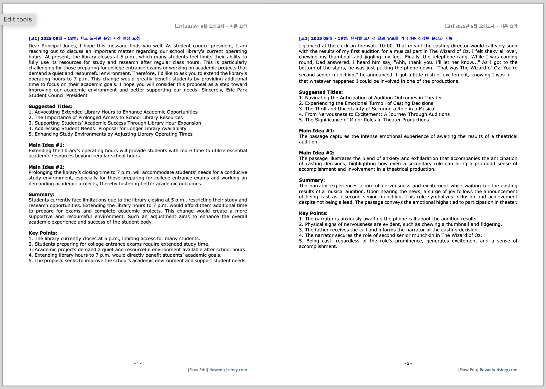 안녕하세요, Flow 영어연구소입니다. 2025년도 9월 고1 영어 모의고사>의 한줄해석 자료 올립니다.설명문/실용문을 포함 모든 지문을 대상으로 작업했습니다. 자료는 PDF와 Word 파일 모두 올립니다.