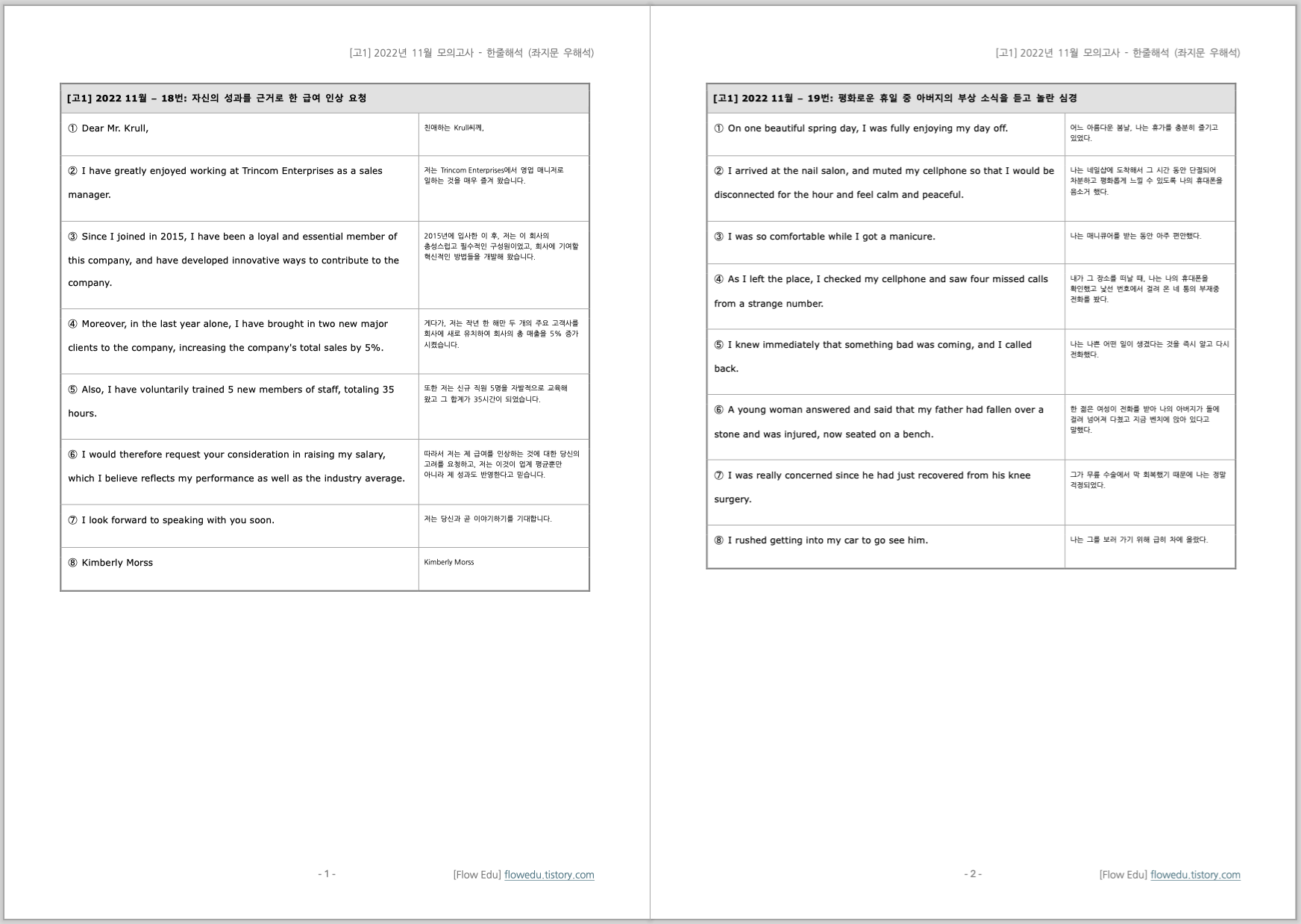 안녕하세요, Flow 영어연구소입니다. 2022년도 11월 고1 영어 모의고사>의 한줄해석 자료 올립니다.설명문/실용문을 포함 모든 지문을 대상으로 작업했습니다. 자료는 PDF와 Word 파일 모두 올립니다.