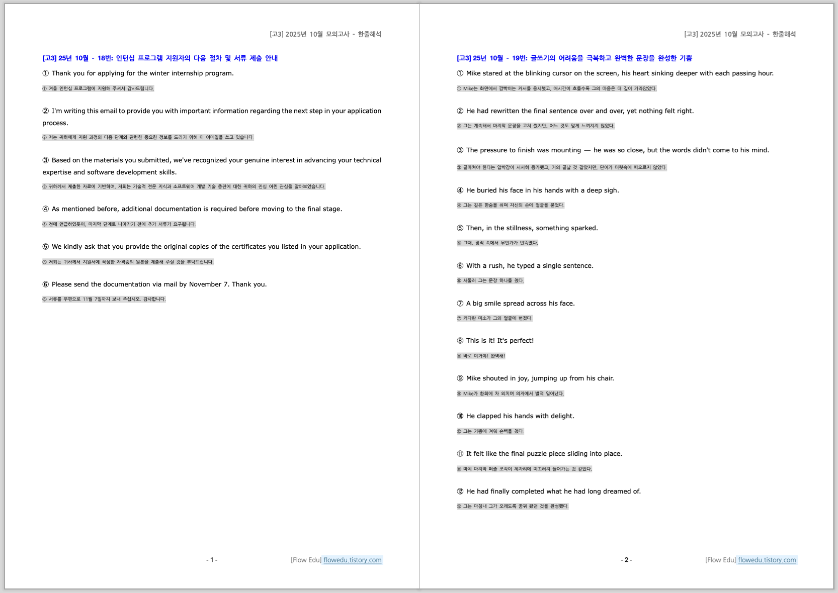 안녕하세요, Flow 영어연구소입니다. 오늘은 2025년도 10월 고3 영어 모의고사>의 한줄해석(좌지문 우해석) 자료 올립니다.설명문/실용문 포함 전지문 작업했습니다. 자료는 PDF와 Word 파일 모두 올
