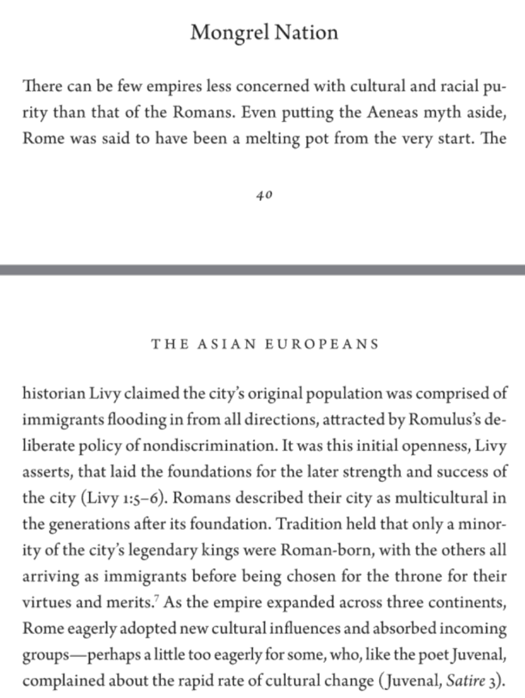 Rome was said to have been a melting pot from the very start. The historian Livy claimed the city's original population was comprised of immigrants flooding in from all directions, attracted by Romulus's deliberate policy of nondiscrimination. It was this initial openness, Livy asserts, that laid the foundations for the later strength and success of the city. Romans described their city as multicultural in the generations after its foundation. Tradition held that only a minority of the city's legendary kings were Roman-born, with the others all arriving as immigrants before being chosen for the throne for their virtues and merits. As the empire expanded across three continents, Rome eagerly adopted new cultural influences and absorbed incoming groups ― perhaps a little too eagerly for some, who, like the poet Juvenal, complained about the rapid rate of cultural change.