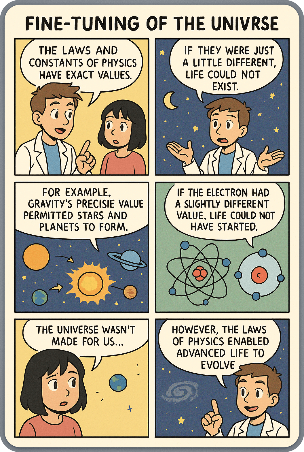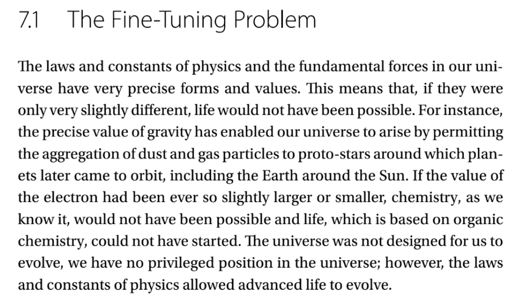 The laws and constants of physics and the fundamental forces in our universe have very precise forms and values. This means that, if they were only very slightly different, life would not have been possible. For instance, the precise value of gravity has enabled our universe to arise by permitting the aggregation of dust and gas particles to proto-stars around which planets later came to orbit, including the Earth around the Sun. If the value of the electron had been ever so slightly larger or smaller, chemistry, as we know it, would not have been possible and life, which is based on organic chemistry, could not have started. The universe was not designed for us to evolve, we have no privileged position in the universe; however, the laws and constants of physics allowed advanced life to evolve.