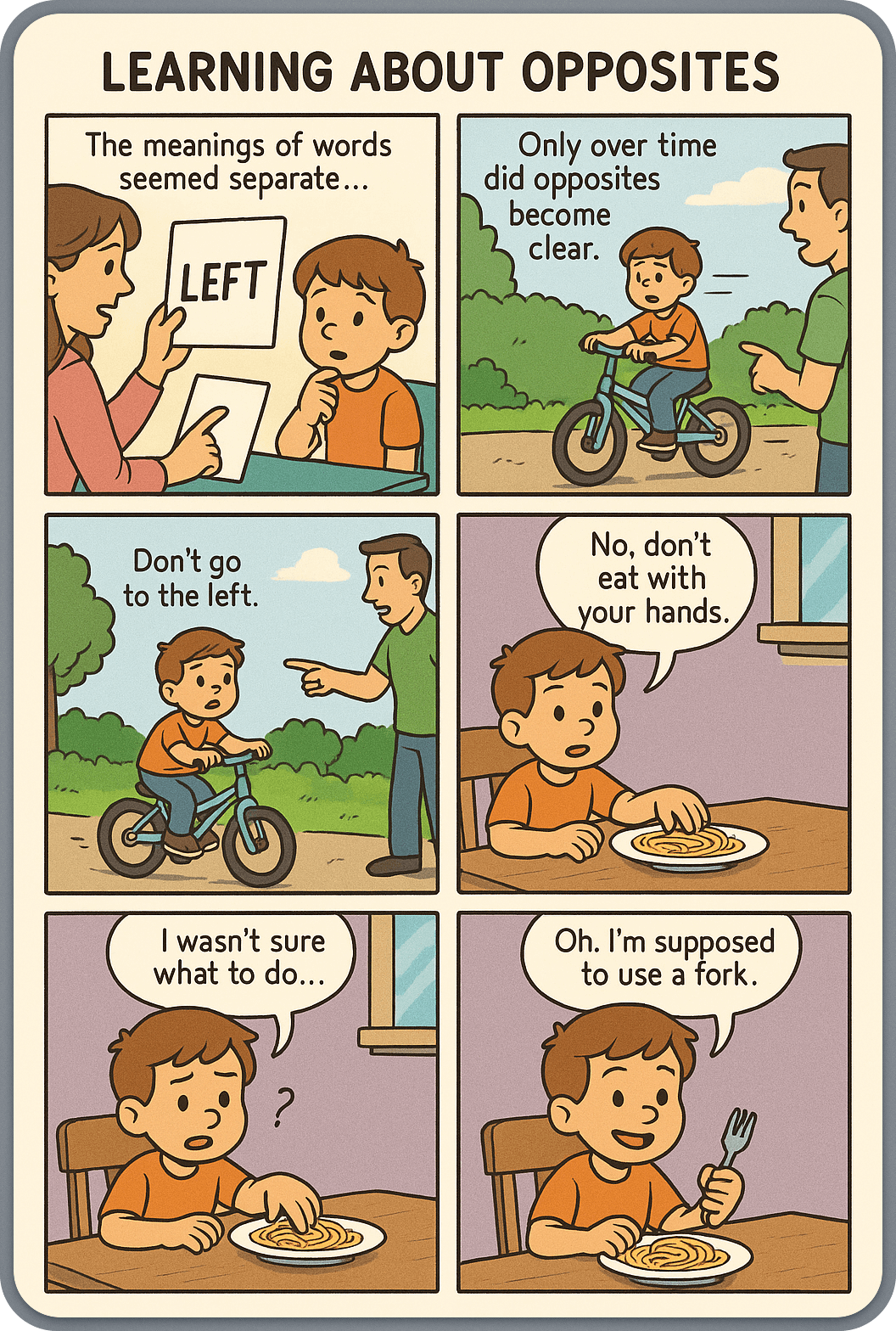 As children, the principle of opposites is foreign. Children perceive words and their meanings separately from each other. It is only in later development that we understood that individual words directly connect to one another. For many children, for instance, it is not clear that 'Right' is the opposite of 'Left'. A vivid example of this can be seen when children learn to ride a bicycle. If parents tell their child "Don't go to the left," they will often find that the child will continue riding straight ahead and not automatically turn to the right. The same applies to the logical connection between 'Yes' and 'No' as perceived by parents. When we were children and were told, for example, "No, don't eat with your hands," we were confused and didn't know what our parents expected from us. Our confusion was about whether we should continue eating or not and if so, how? Only later did we recognize the connection and understand that we should continue eating, but not with our hands but with a fork or a spoon.