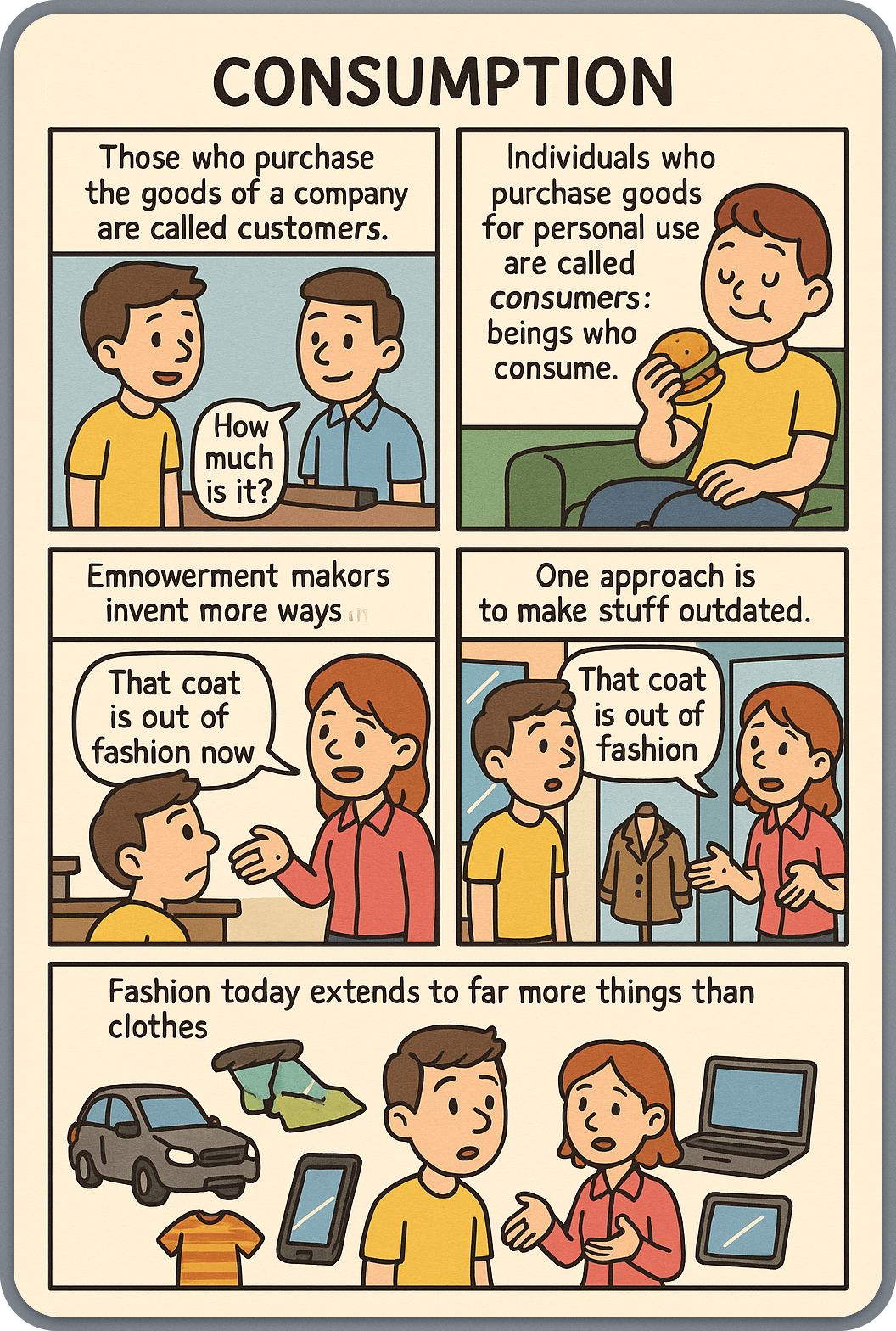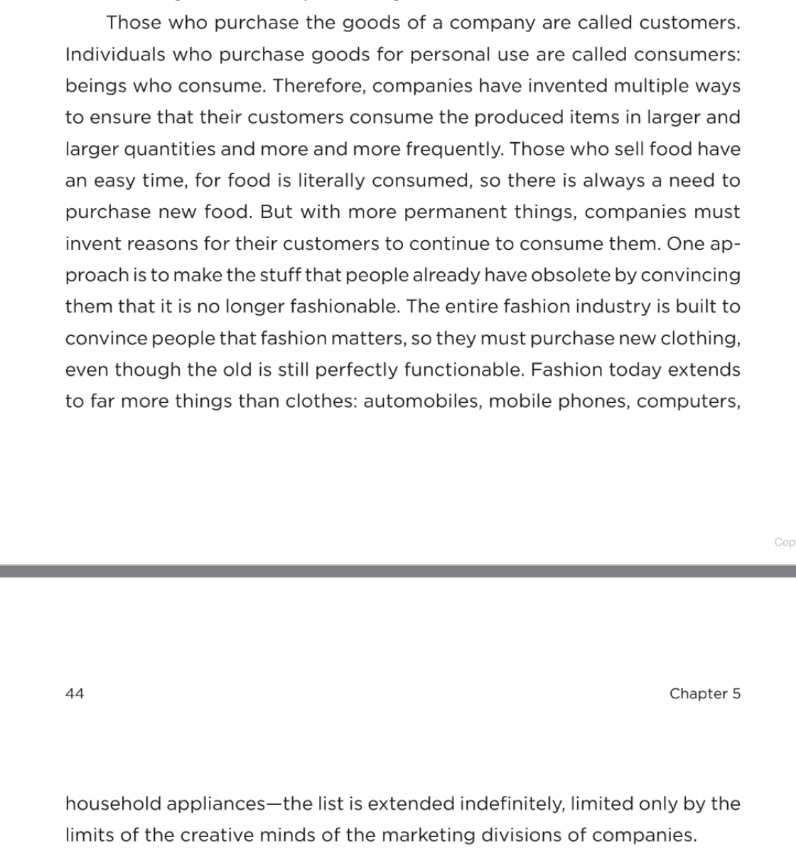 Those who purchase the goods of a company are called customers. Individuals who purchase goods for personal use are called consumers: beings who consume. Therefore, companies have invented multiple ways to ensure that their customers consume the produced items in larger and larger quantities and more and more frequently. Those who sell food have an easy time, for food is literally consumed, so there is always a need to purchase new food. But with more permanent things, companies must invent reasons for their customers to continue to consume them. One approach is to make the stuff that people already have outdated by convincing them that it is no longer fashionable. The entire fashion industry is built to convince people that fashion matters, so they must purchase new clothing, even though the old is still perfectly functionable. Fashion today extends to far more things than clothes: automobiles, mobile phones, computers ― the list is extended indefinitely, limited only by the limits of the creative minds of the marketing divisions of companies.