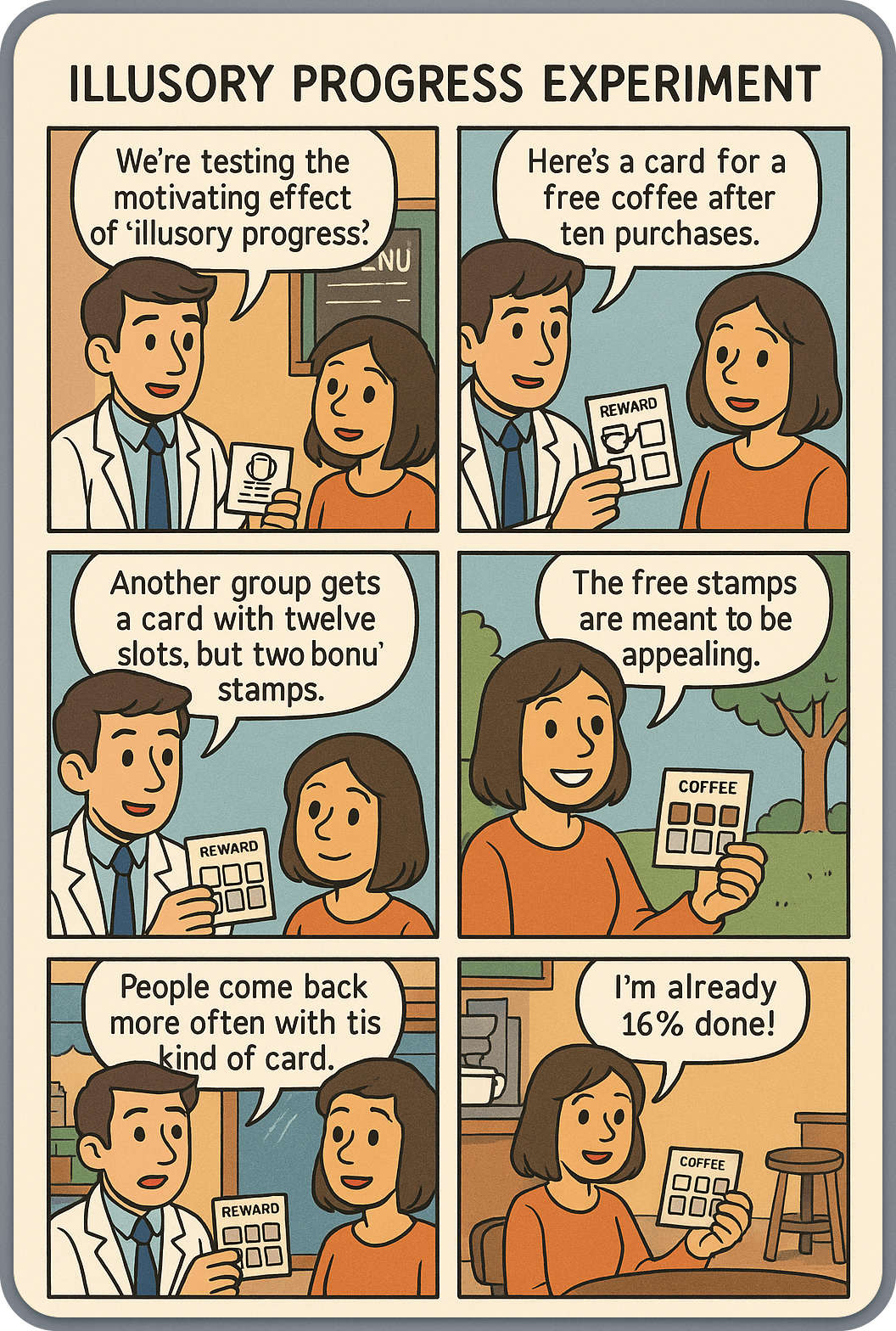 | 1 | Kivetz, Urminsky, and Zheng partnered with a cafe to test the motivating effect of illusory progress in an experiment. | Let’s go back to the example of café loyalty cards. Ran Kivetz, Oleg Urminsky, and Yuhuang Zheng partnered with a New York café to test the motivating effect of illusory progress in an experiment. |