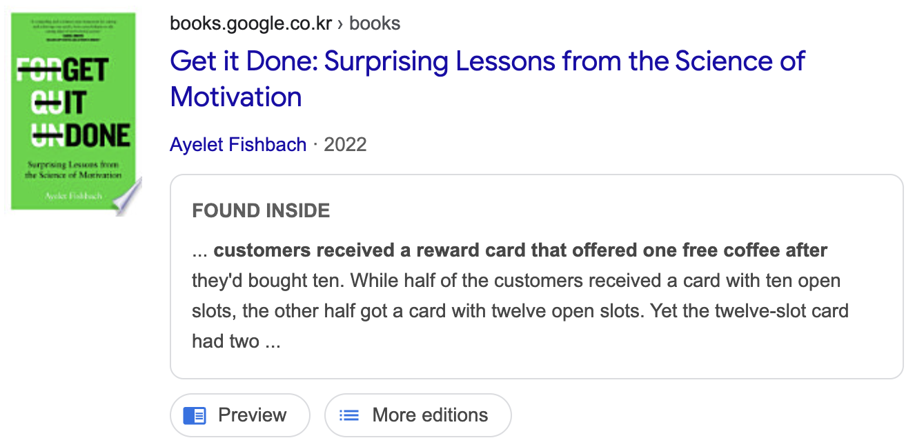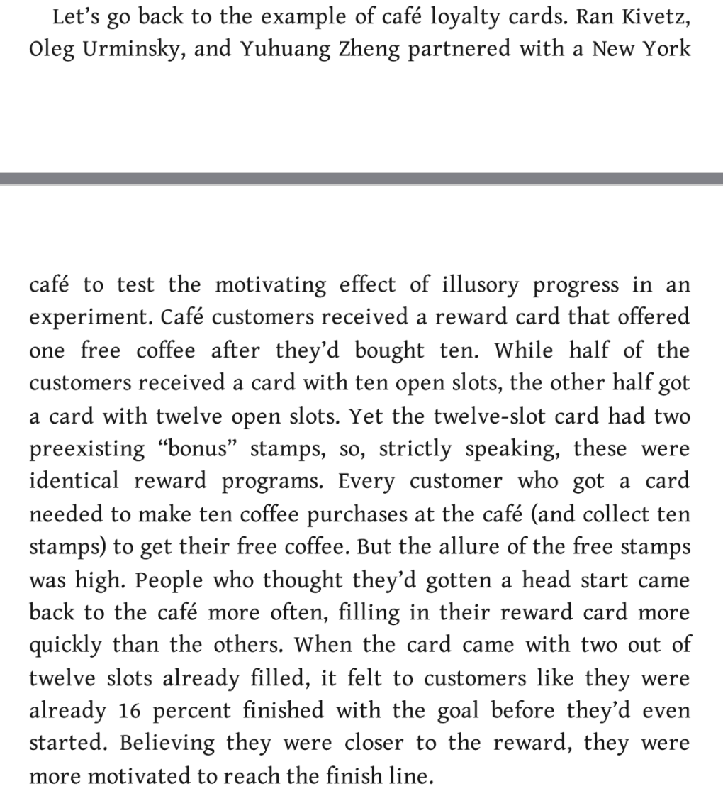 Kivetz, Urminsky, and Zheng partnered with a cafe to test the motivating effect of illusory progress in an experiment. Customers received a reward card that offered one free coffee after they'd bought ten. While half of the customers received a card with ten open slots, the other half got a card with twelve open slots. Yet the twelve-slot card had two preexisting "bonus" stamps, so, strictly speaking, these were identical reward programs. Every customer who got a card needed to make ten coffee purchases (and collect ten stamps) to get their free coffee. But the appeal of the free stamps was high. People who thought they'd gotten a head start came back to the cafe more often, filling in their reward card more quickly than the others. When the card came with two out of twelve slots already filled, it felt to customers like they were already 16 percent finished with the goal before they'd even started. Believing they were closer to the reward, they were more motivated to reach the finish line.