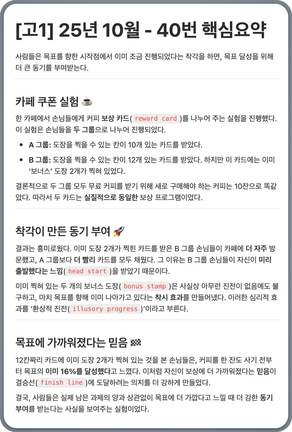 [고1] 25년 10월 - 40번: 목표 달성에 동기를 부여하는 착시적 진전의 효과