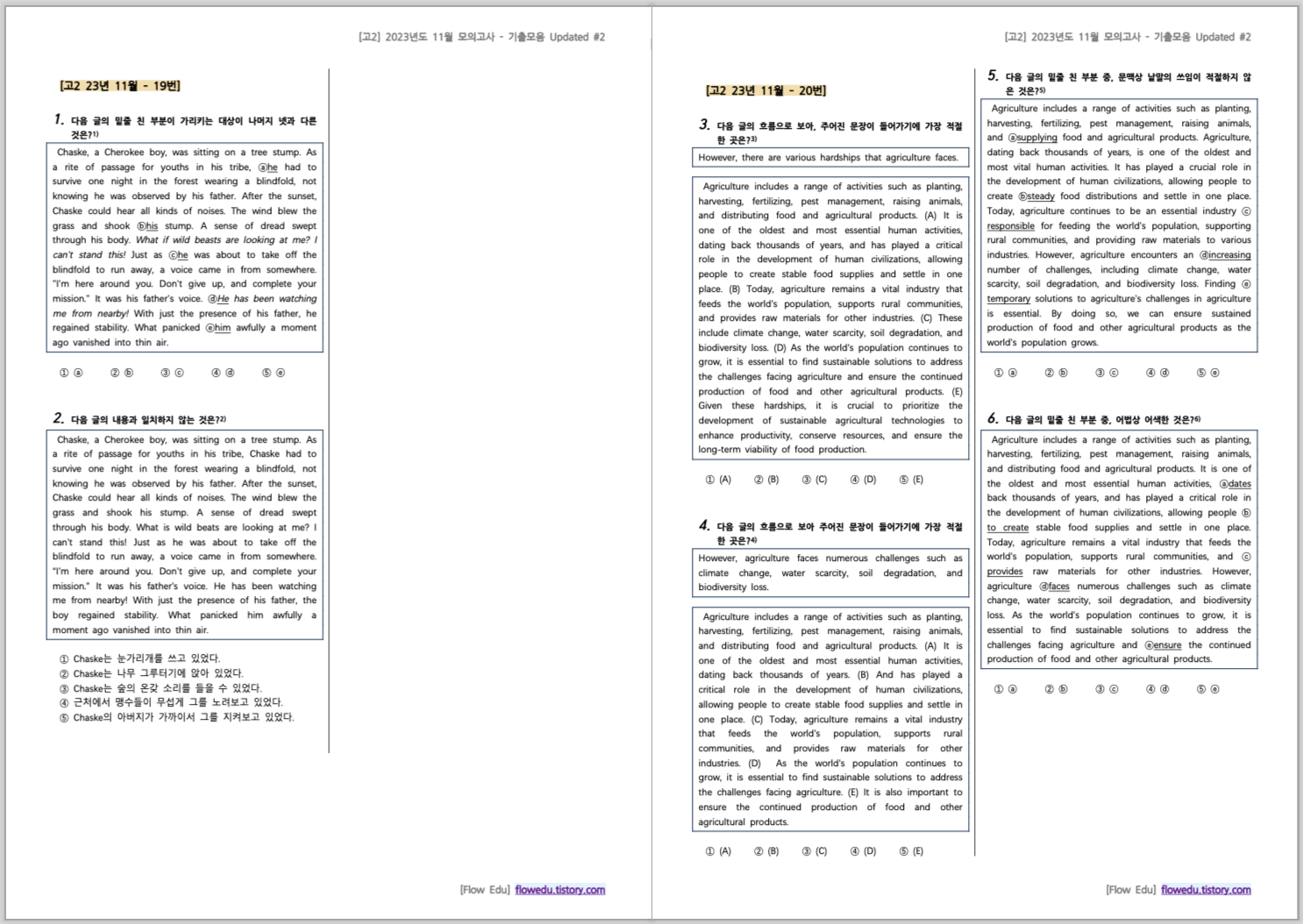 안녕하세요, Flow 영어연구소입니다. 오늘은 2023년도 11월 고1~2 영어 모의고사>의 지문 텍스트만한글 파일 hwpx와 pdf 파일로 정리해서 올립니다.변형문제 출제를 위해 해당 지문들을 hwp 한글 파