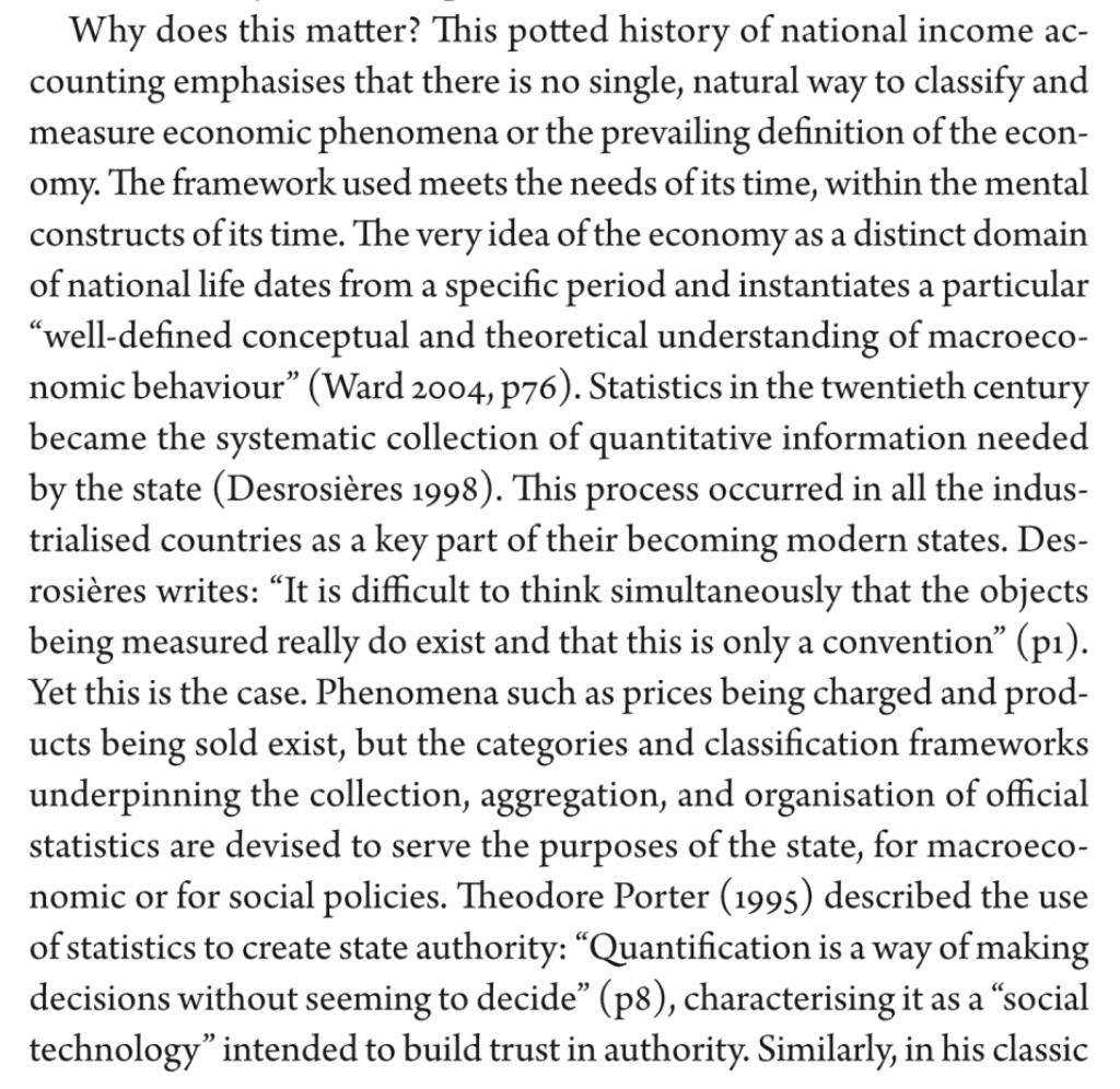 | 8 | Phenomena such as prices being charged and products being sold exist, but the categories and classification frameworks supporting the collection, aggregation, and organisation of official statistics are devised to serve the purposes of the state, for macroeconomic or for social policies. | Phenomena such as prices being charged and products being sold exist, but the categories and classification frameworks underpinning the collection, aggregation, and organisation of official statistics are devised to serve the purposes of the state, for macroeconomic or for social policies. |