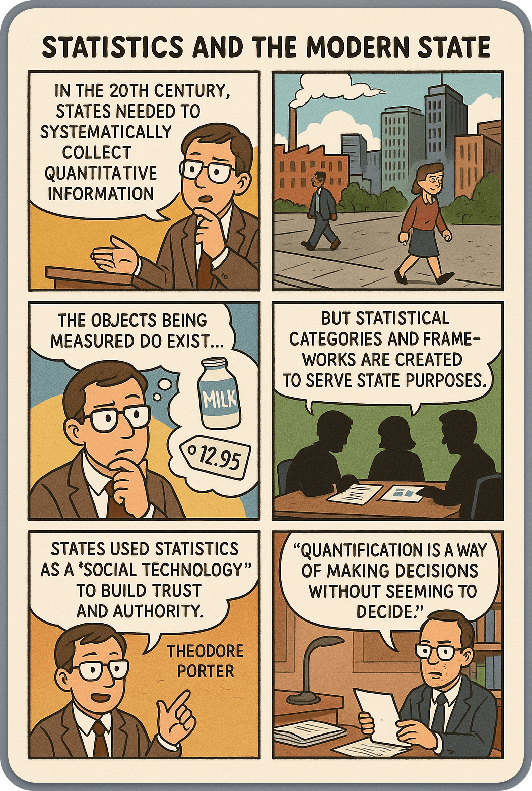 Statistics in the twentieth century became the systematic collection of quantitative information needed by the state. This process occurred in all the industrialised countries as a key part of their becoming modern states. Desrosieres writes: "It is difficult to think simultaneously that the objects being measured really do exist and that this is only a convention". Yet this is the case. Phenomena such as prices being charged and products being sold exist, but the categories and classification frameworks supporting the collection, aggregation, and organisation of official statistics are devised to serve the purposes of the state, for macroeconomic or for social policies. Theodore Porter described the use of statistics to create state authority: "Quantification is a way of making decisions without seeming to decide", characterising it as a "social technology" intended to build trust in authority.