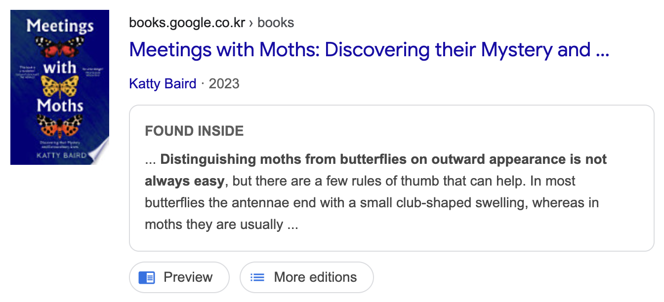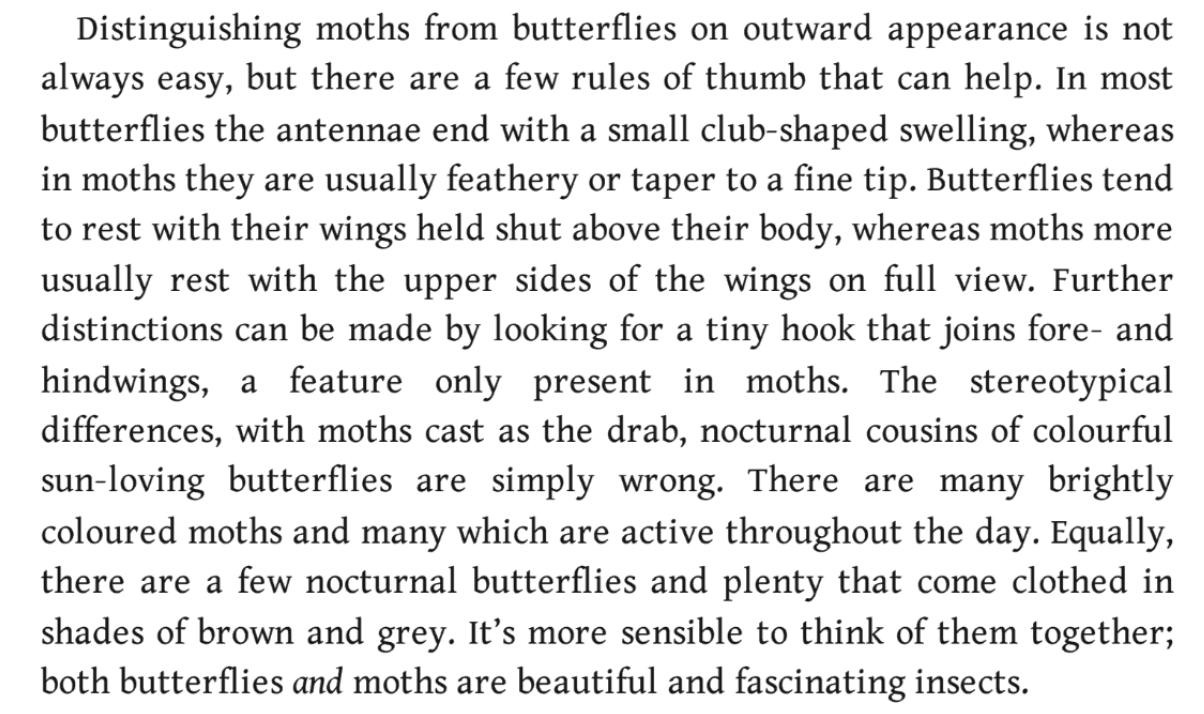 | 4 | Further distinctions can be made by looking for a tiny hook that joins fore- and hindwings, a feature only present in moths. | Further distinctions can be made by looking for a tiny hook that joins fore- and hindwings, a feature only present in moths. |