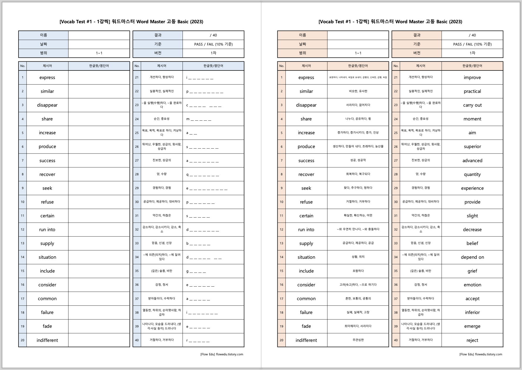 안녕하세요, Flow 영어연구소입니다. 워드마스터 Word Master 고등 어원 (2023년도 발행)어휘 시험지 및 답지 PDF 공유합니다.시험지 제작에는 모두 표제어만 이용했습니다. 첫번째 Vocab Test는 1강씩 30