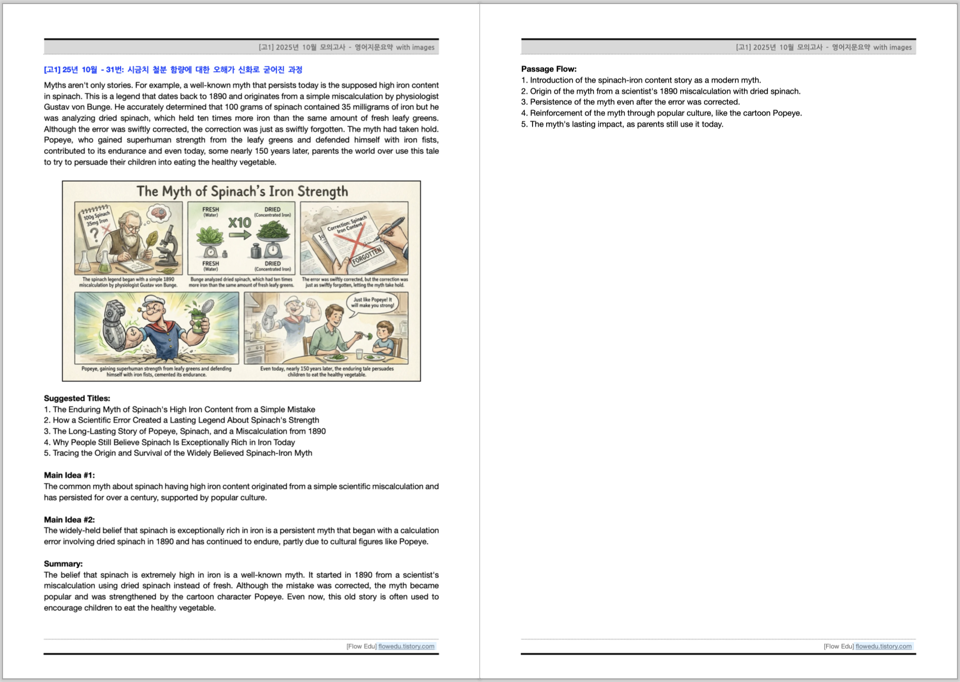 안녕하세요, Flow 영어연구소입니다.오늘은 2025년도 10월 고1~3 영어 모의고사>의 지문 요약 자료 올립니다.ChatGPT 유료 버전(ChatGPT-4.1-mini)으로 작업했고,설명문/실용문을 제외한 전지문을 포함했습