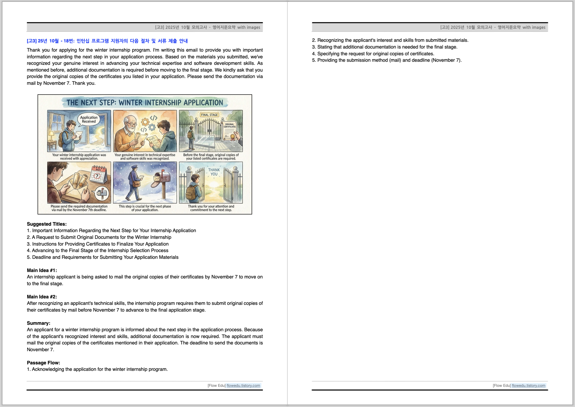 안녕하세요, Flow 영어연구소입니다.오늘은 2025년도 10월 고1~3 영어 모의고사>의 지문 요약 자료 올립니다.ChatGPT 유료 버전(ChatGPT-4.1-mini)으로 작업했고,설명문/실용문을 제외한 전지문을 포함했습