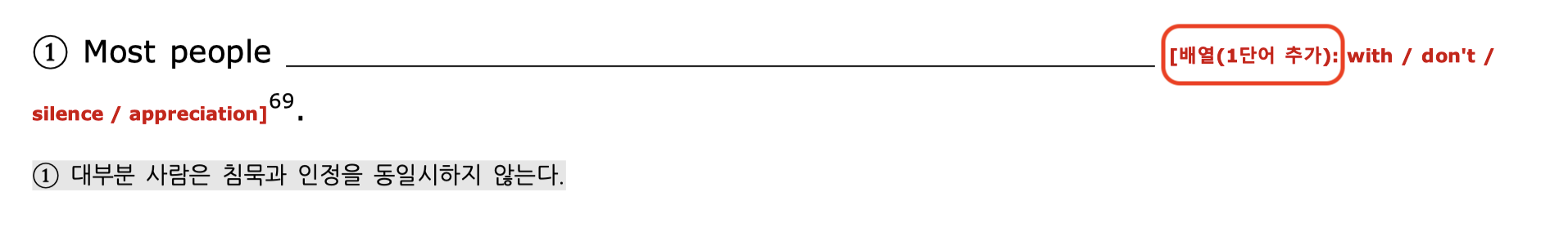 - 배열할 단어 중 주요 단어를 변형하거나 추가하도록 했습니다