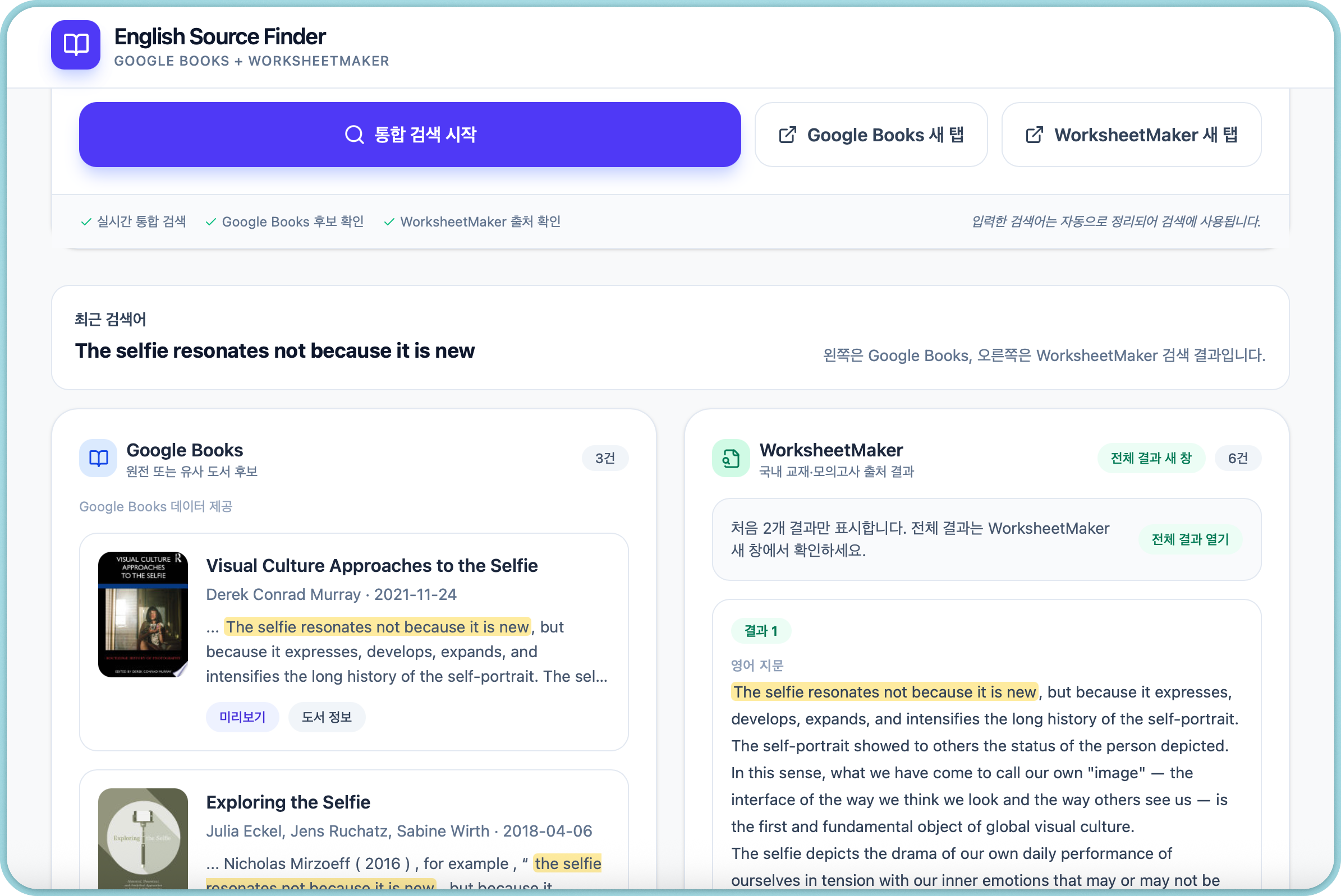 수능이나 모평 영어 지문의 원문을 검색하고 싶을 때 사용하시면 됩니다.검색 문구를 입력하고 검색하기 버튼을 누르면, Google Books에서 해당 원문을 검색해 줍니다. https://english-finder.vercel.app/ 위 링크 저장해서 이용하시거나 아래 검색기 이용하세요.발로 만들었어요. 이런거 처음 해봐서 시간이 좀 걸렸습니다.유용하게 사용하세요~ [업데이트 V2] 지문 검색기를 좀 더 수정했어요.전에는 문구 검색하면 구글북스 창이 새로 열렸어요. 여기에 워크시트메이커 결과 창을 통합해 봤습니다. (워크시트메이커 결과는 1개로 한정시켰고, 전체 결과는 링크로 직접 갈 수 있게 했습니다.) 내신 시험지의 문구를 입력하면,워크시트메이커에서는 어느 교재나 모평에서 사용됐는지 알려주고,구글북..